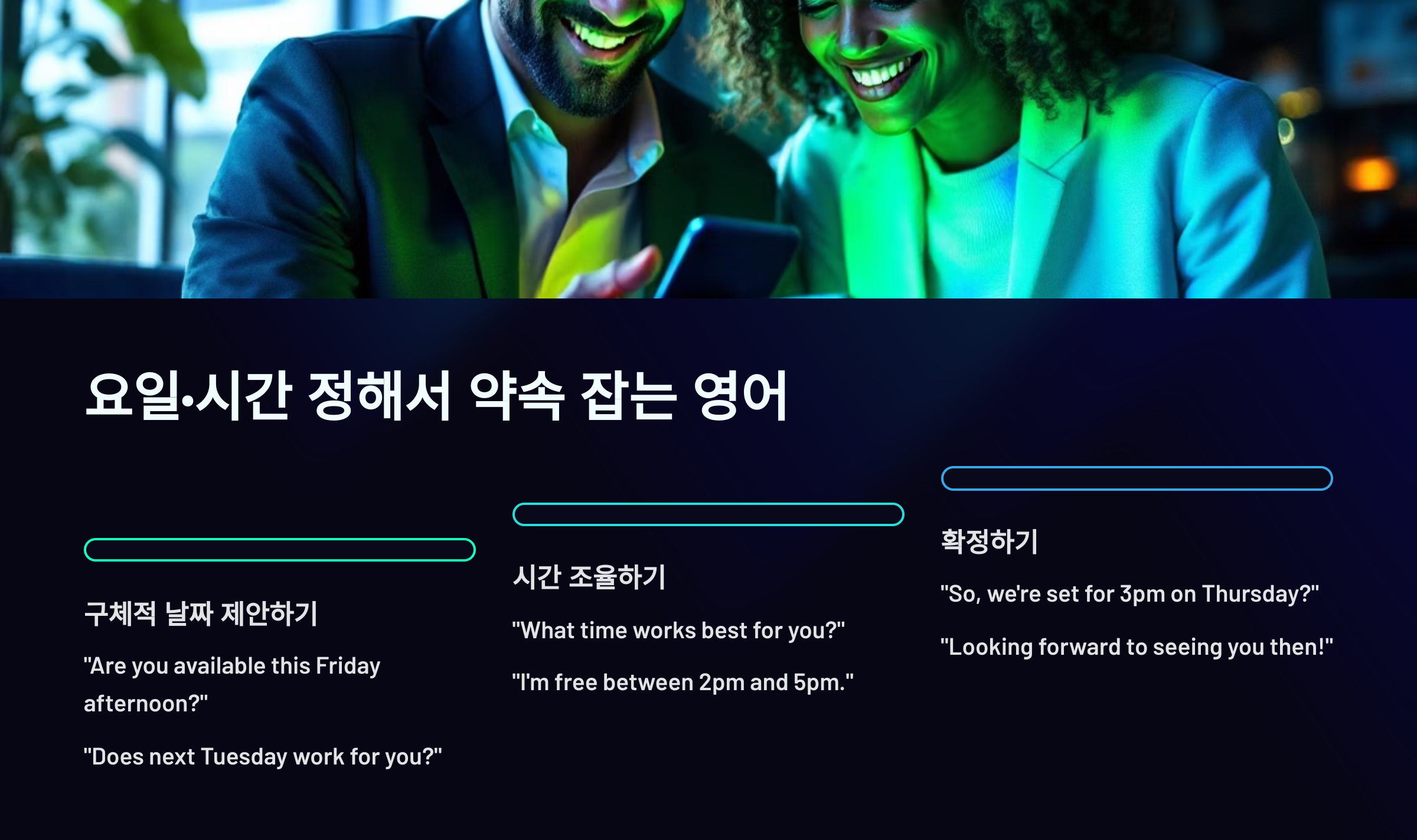 이제 다음은 📍 요일·시간 정해서 약속 잡는 영어 구체적인 날짜와 시간을 이야기할 때 자주 쓰는 표현들을 소개할게요!