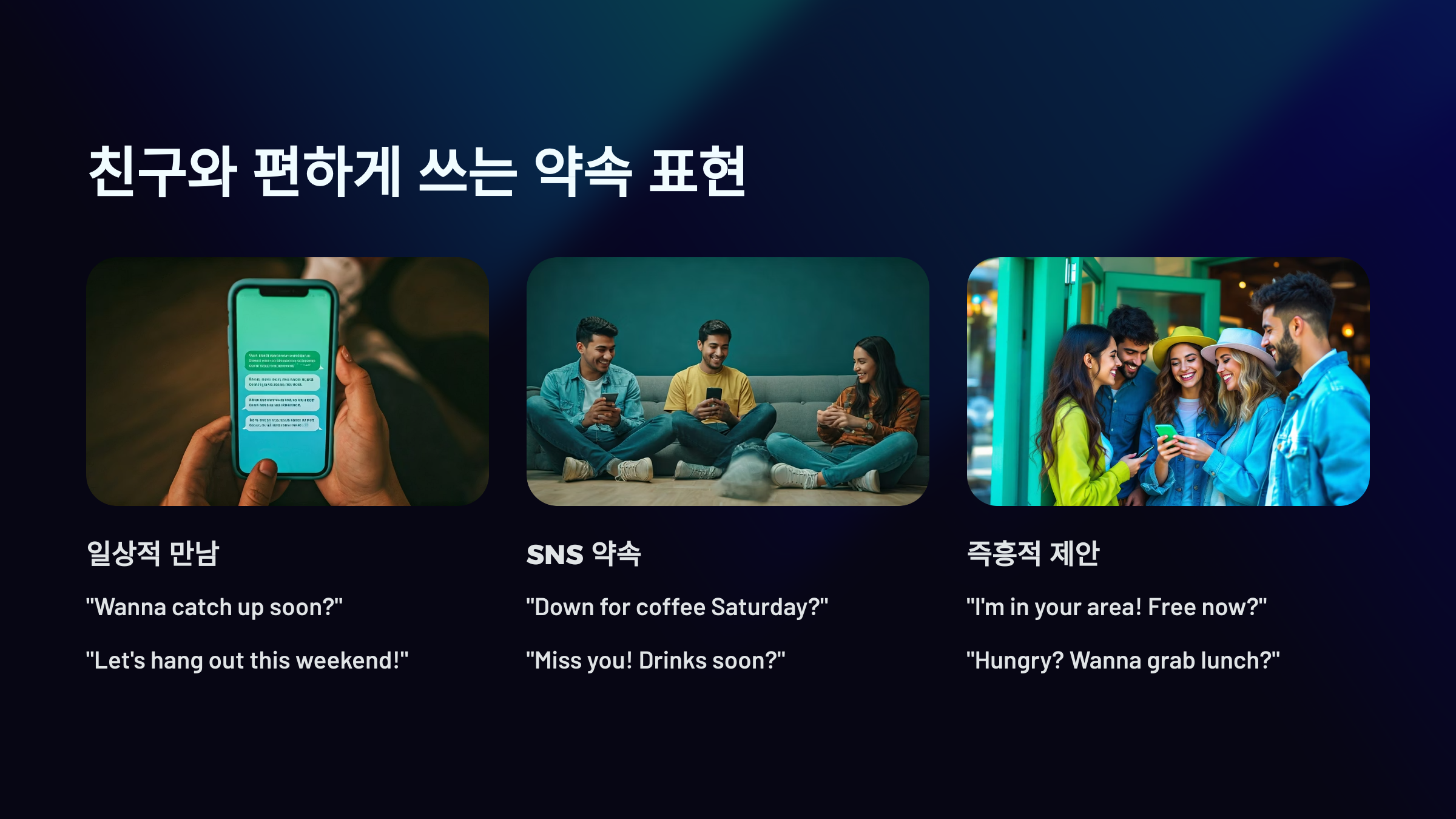 친구와의 약속은 형식보다 자연스러운 리듬이 더 중요해요. 그래서 슬랭이나 축약형도 편하게 자주 쓰인답니다 💬