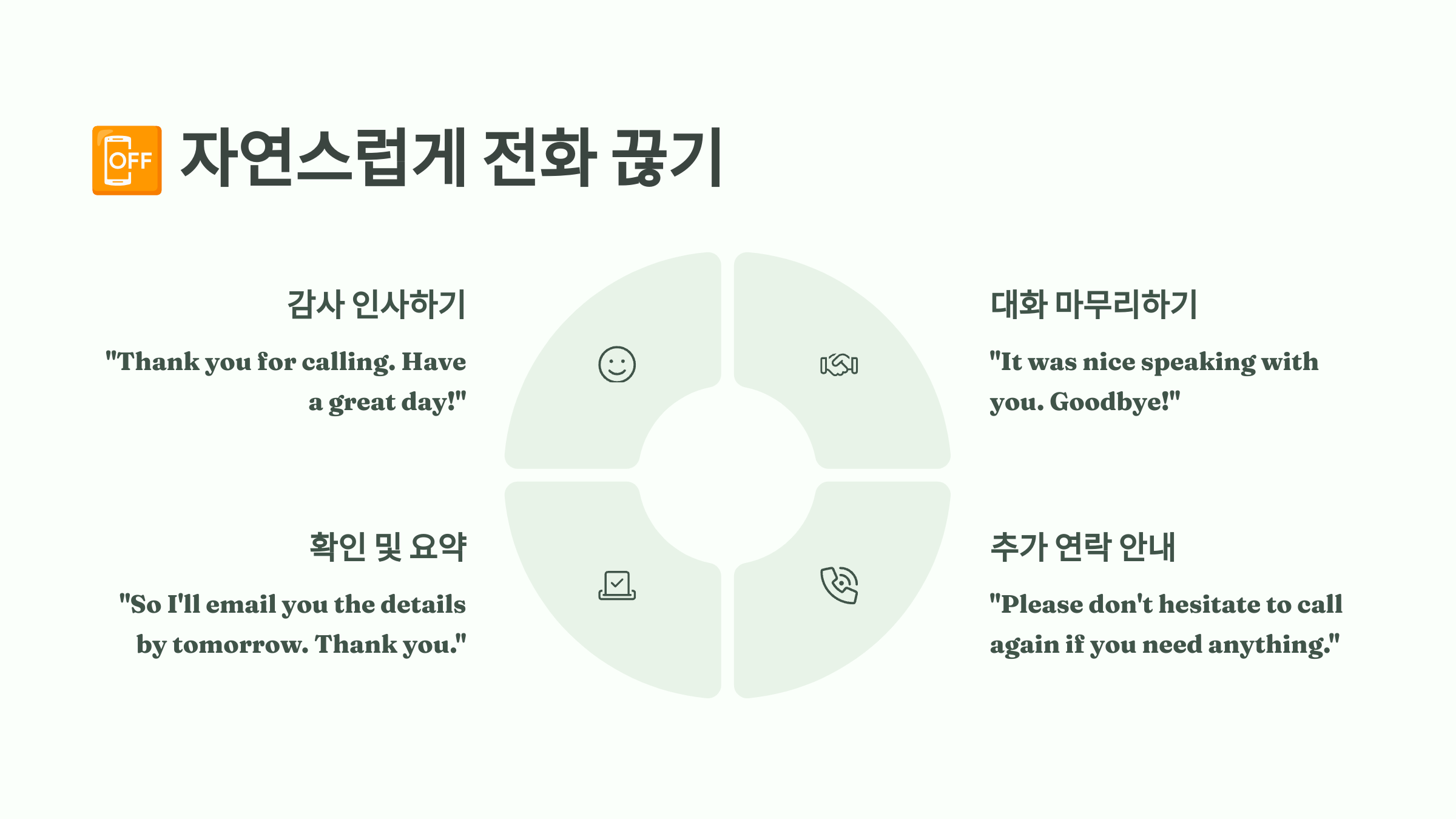 전화를 마무리할 때 자주 쓰는 표현은 “Thank you for calling.”, “Have a great day.”, 그리고 “Talk to you soon.” 등 부드러운 마무리 인사들이에요 🌈📞