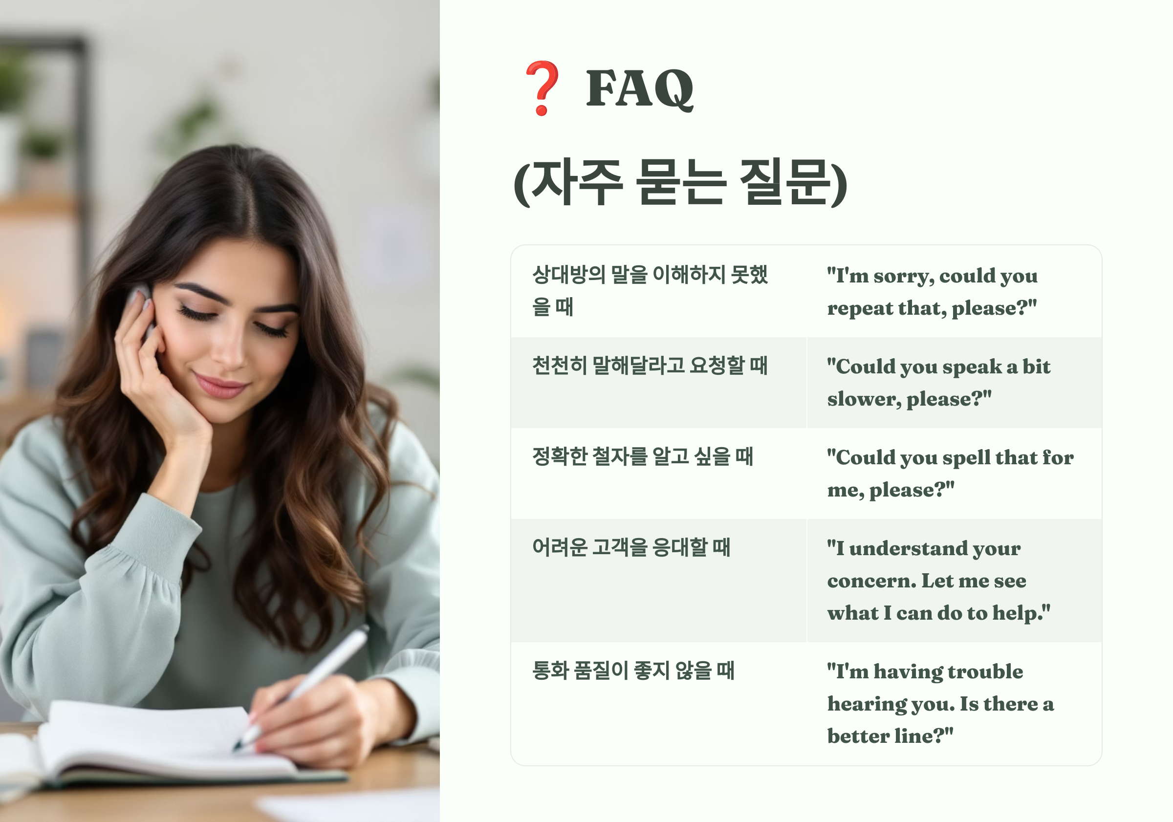 이제 실제 상황에서 전화받는 게 덜 무섭고 훨씬 자신감 생기죠? 😎📞 다음은 ❓ FAQ (자주 묻는 질문) 섹션으로 이어갈게요! 가장 헷갈리는 전화영어 궁금증 8가지를 해결해줄게요 🙋♀️🧠