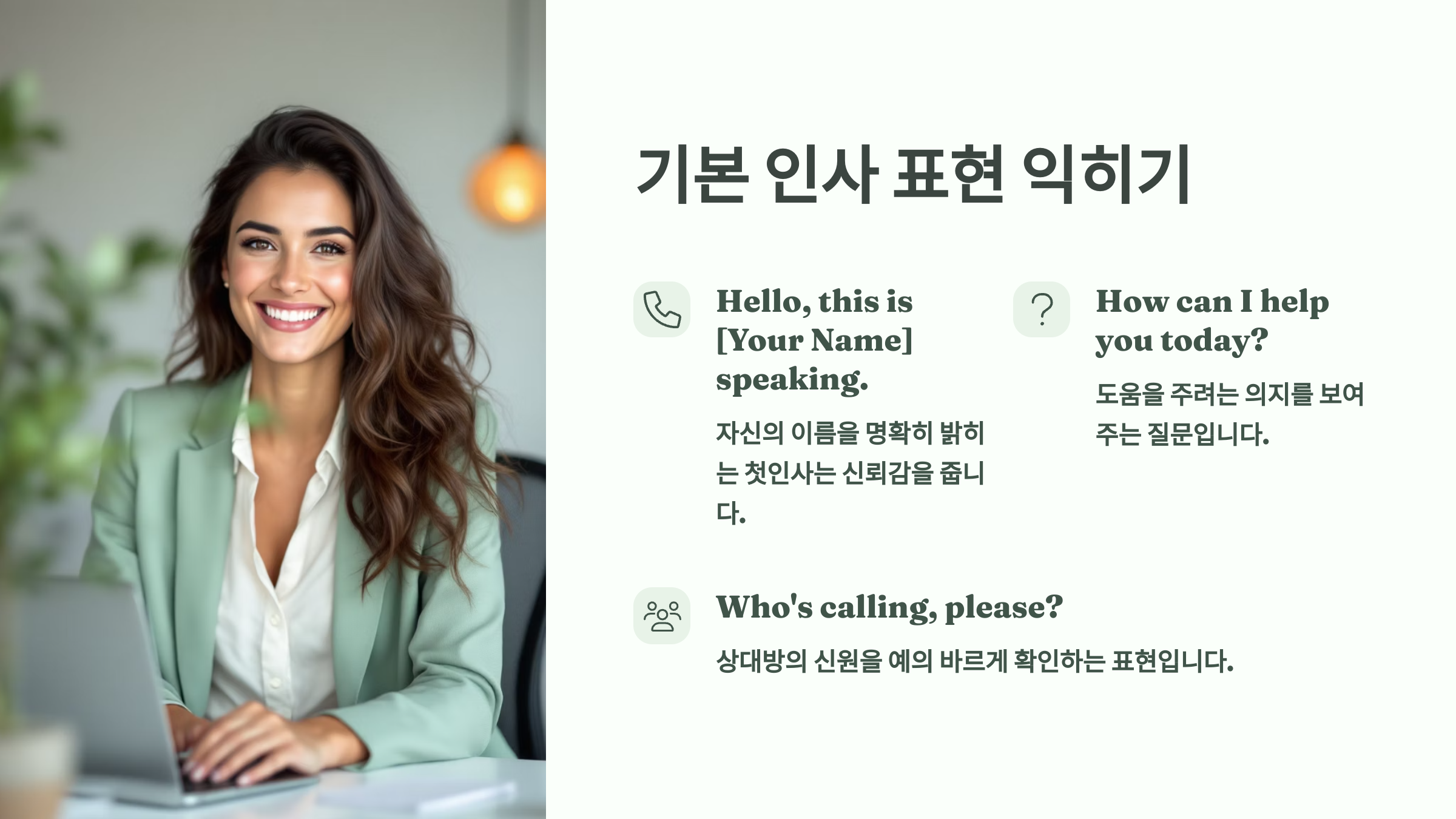 가장 먼저 살펴볼 건 💬 기본 인사 표현 익히기예요. 전화를 시작할 때 쓰는 첫마디가 전체 대화의 분위기를 결정하거든요! 🌟