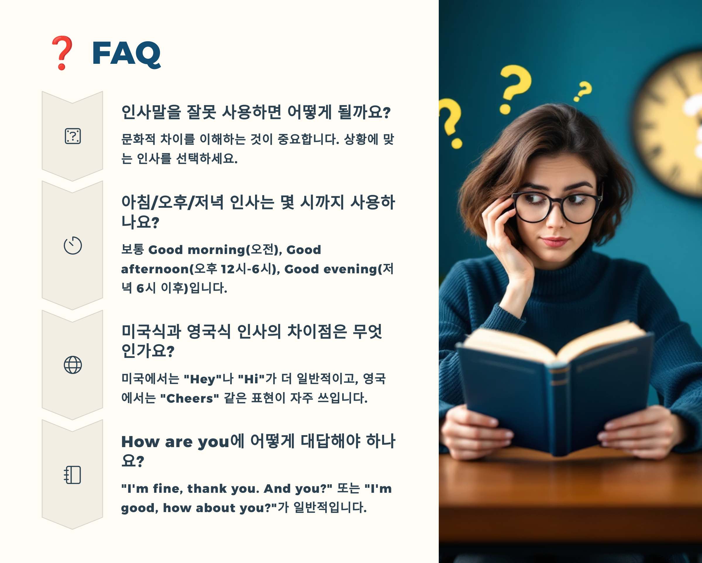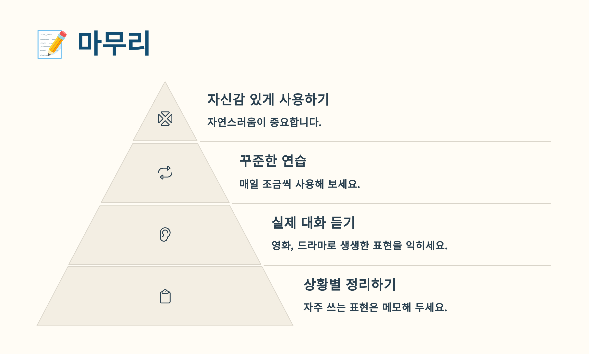 이제 영어로 인사하는 게 어색하지 않게 느껴지면 정말 뿌듯할 거예요. 다 외우려고 애쓰기보단, 상황에 맞는 표현을 몇 개씩 골라서 말로 연습해보는 걸 추천해요. 특히 일상에서 직접 써보면 내 말이 점점 자연스러워지는 걸 느낄 수 있어요! 🎤