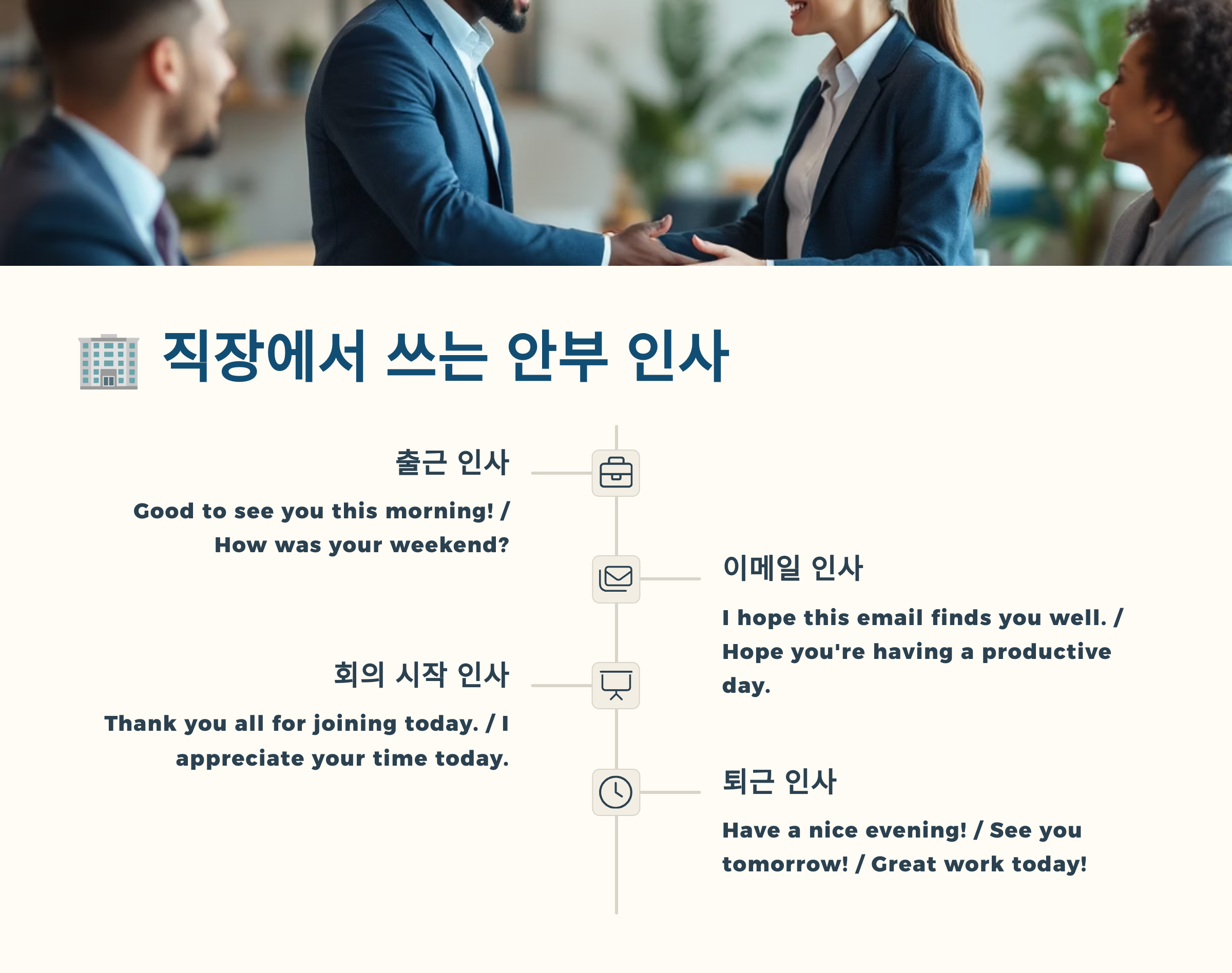 직장에서는 일만 잘한다고 다가 아니죠. 🤝 동료들과의 유대감, 상사와의 원활한 소통도 무척 중요해요. 이럴 때 자연스럽게 안부를 묻는 인사는 좋은 인상을 주는 첫걸음이 될 수 있어요. 딱딱하거나 과하게 공손하지 않으면서도, 예의는 갖춘 영어 표현들을 알고 있다면 훨씬 더 스마트하게 커뮤니케이션할 수 있어요. 💼