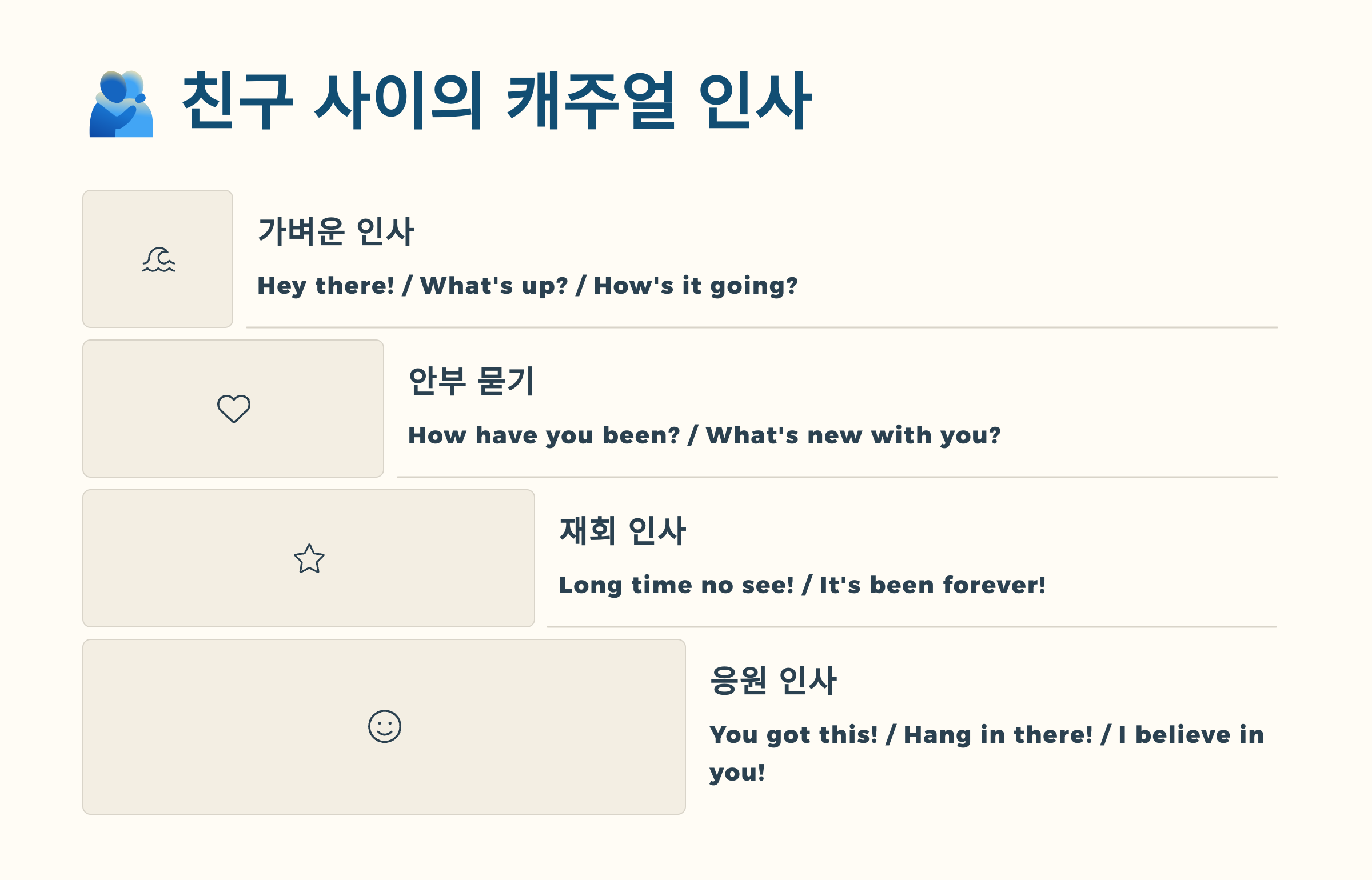 - 친구나 동료: “Yo!”, “What’s up?”, “How’s it going?” → 친근감 있게!