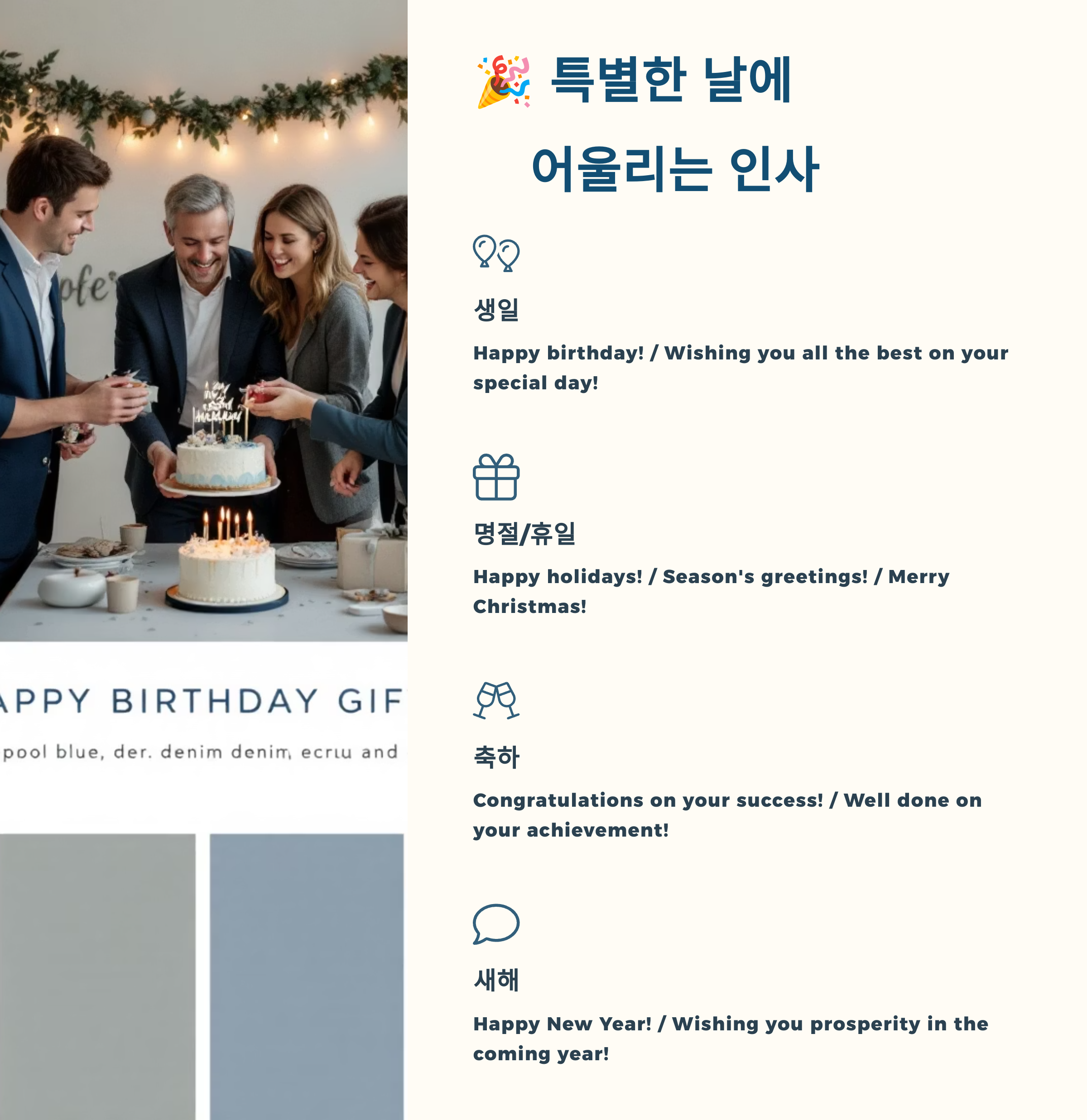 - 축하 상황: “Congrats!”, “Wishing you all the best!” → 따뜻한 마음 전달!