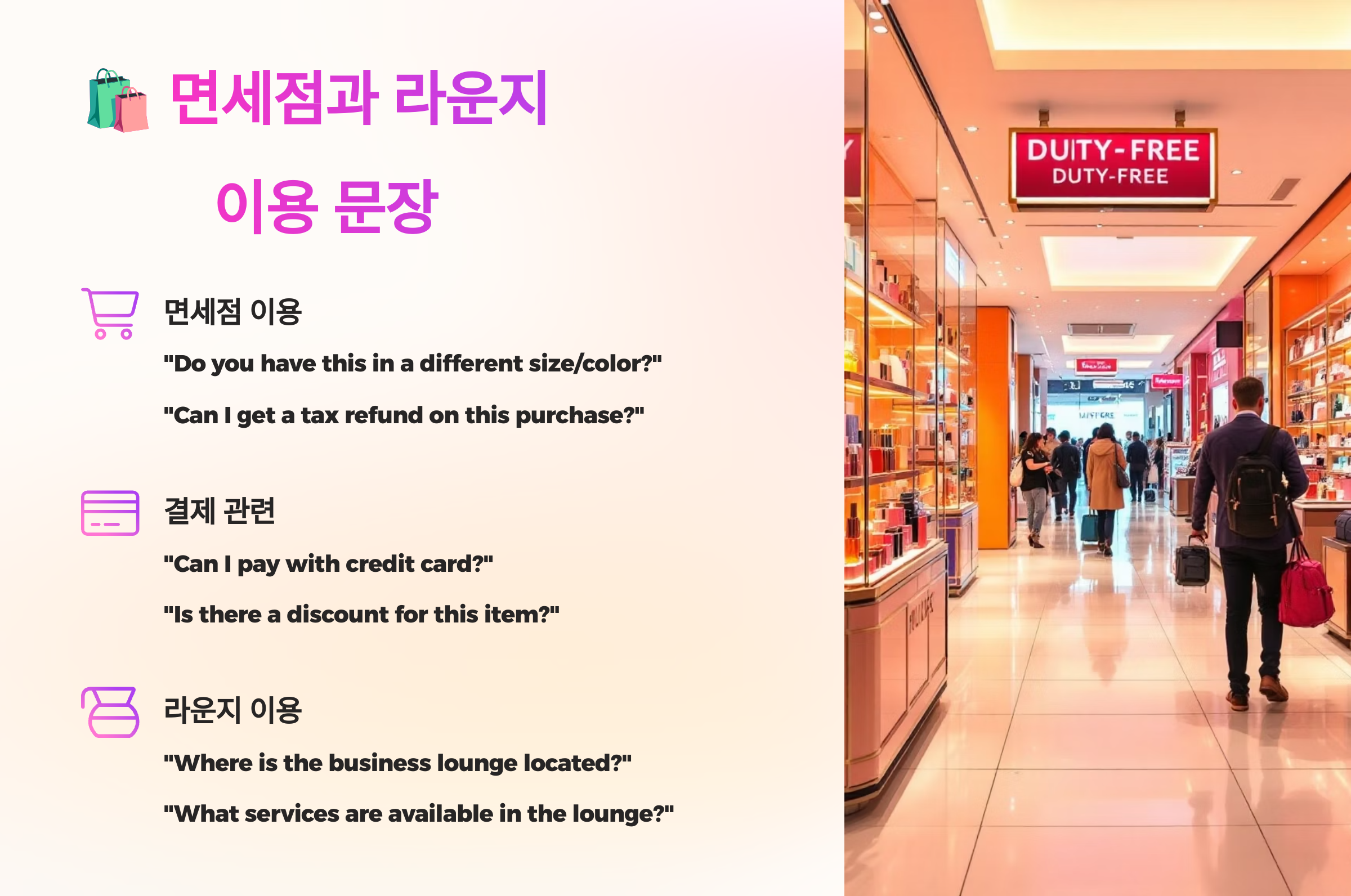 공항 면세점이나 라운지에서는 필요한 상품을 구매하거나 편안하게 휴식을 취할 수 있어요. 필요한 영어 표현을 미리 알아두면 훨씬 여유롭게 이용할 수 있어요! 🎁
