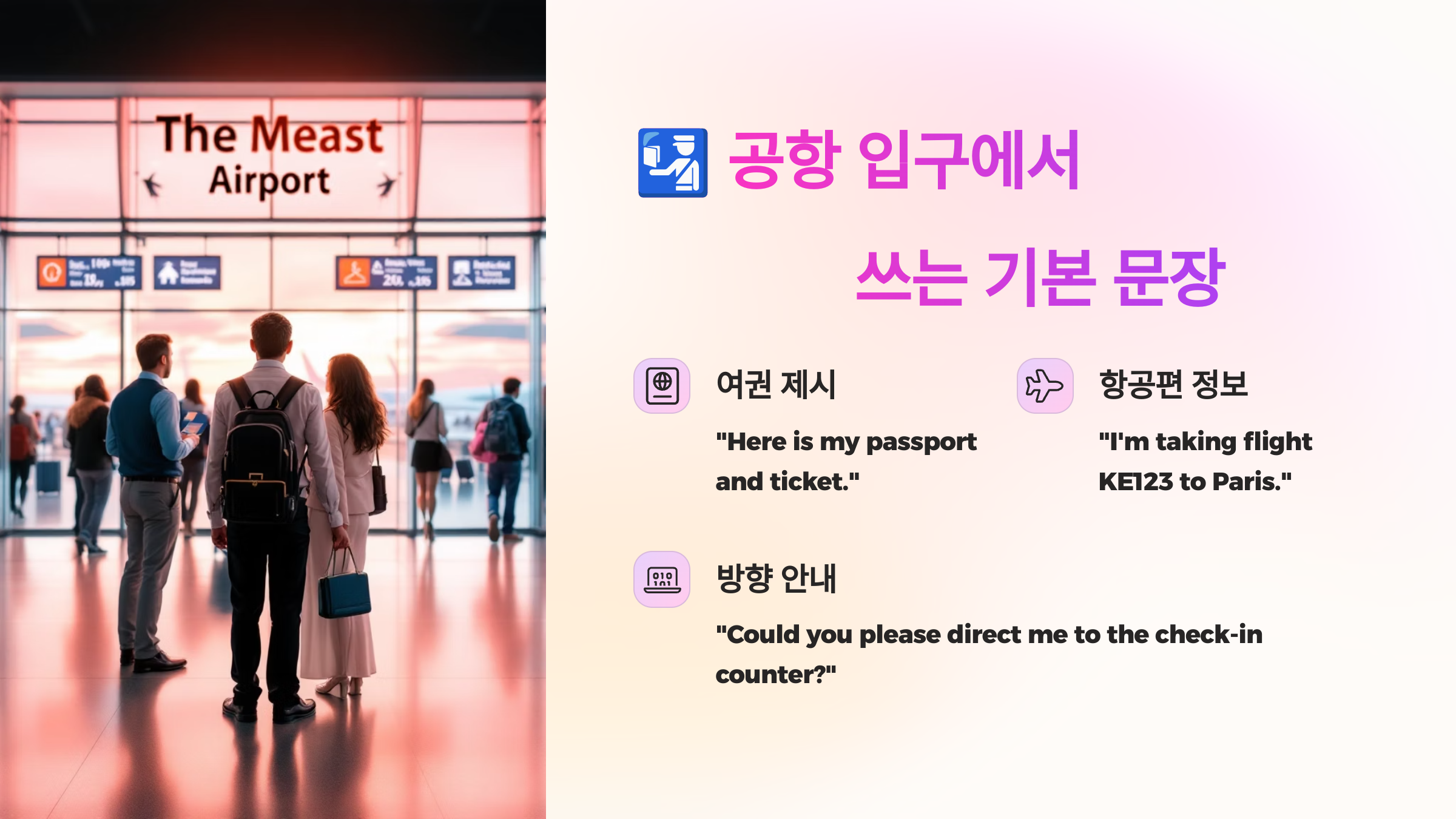 기본적인 질문 몇 가지만 자연스럽게 말할 수 있으면, 공항 수속의 시작이 훨씬 부드러워질 거예요! ✈️