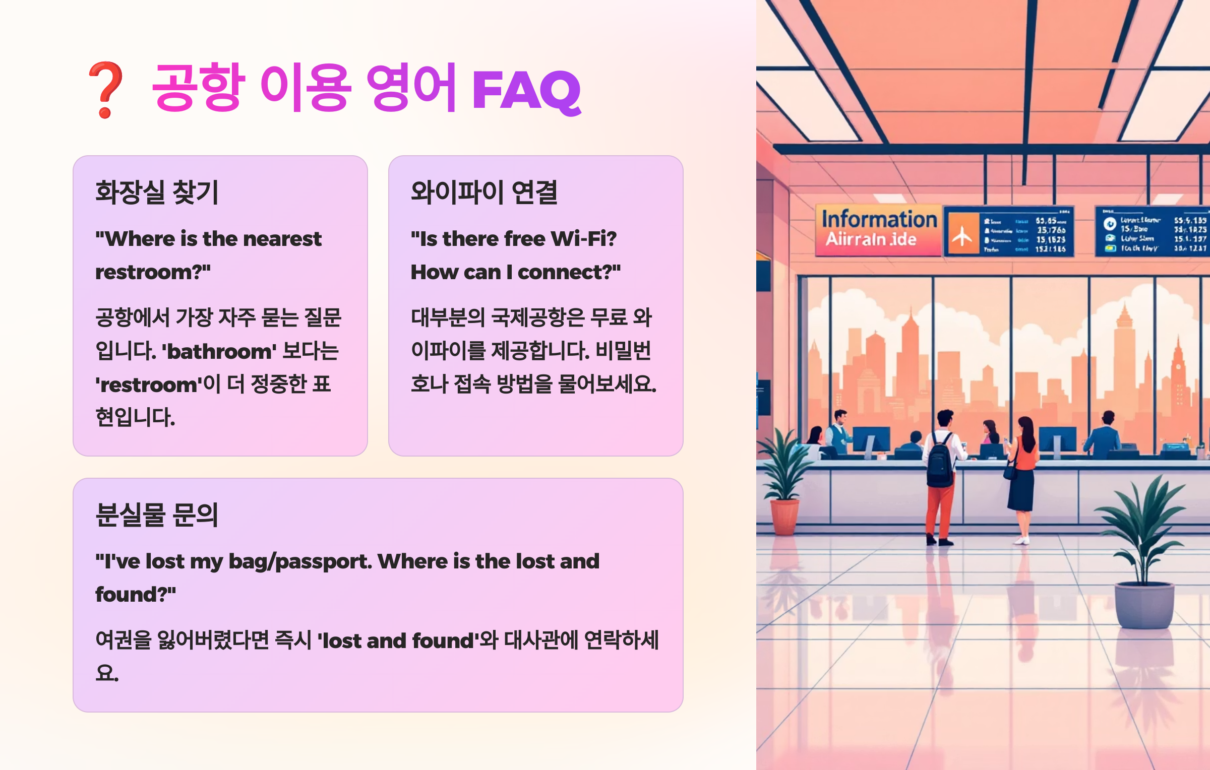 "내가 생각했을 때" 공항 영어는 문법보다도 자신감과 준비성이 중요해요. 준비만 제대로 하면, 어떤 상황에서도 당당하게 대처할 수 있어요! 🎯