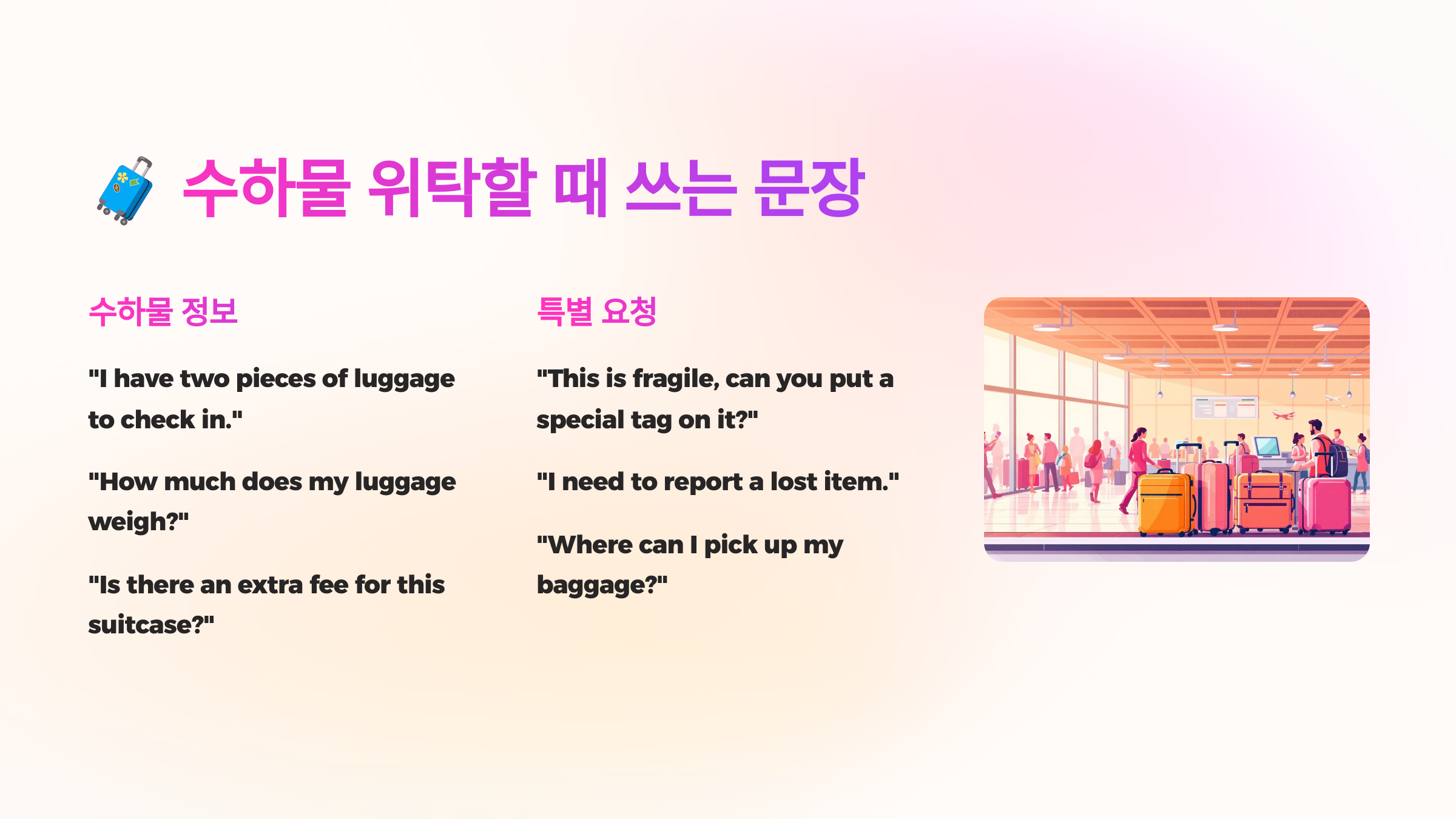 수하물을 부칠 때는 정확하게 요청하고, 내 짐이 제대로 처리되는지 꼭 확인하는 게 중요해요! 🎒