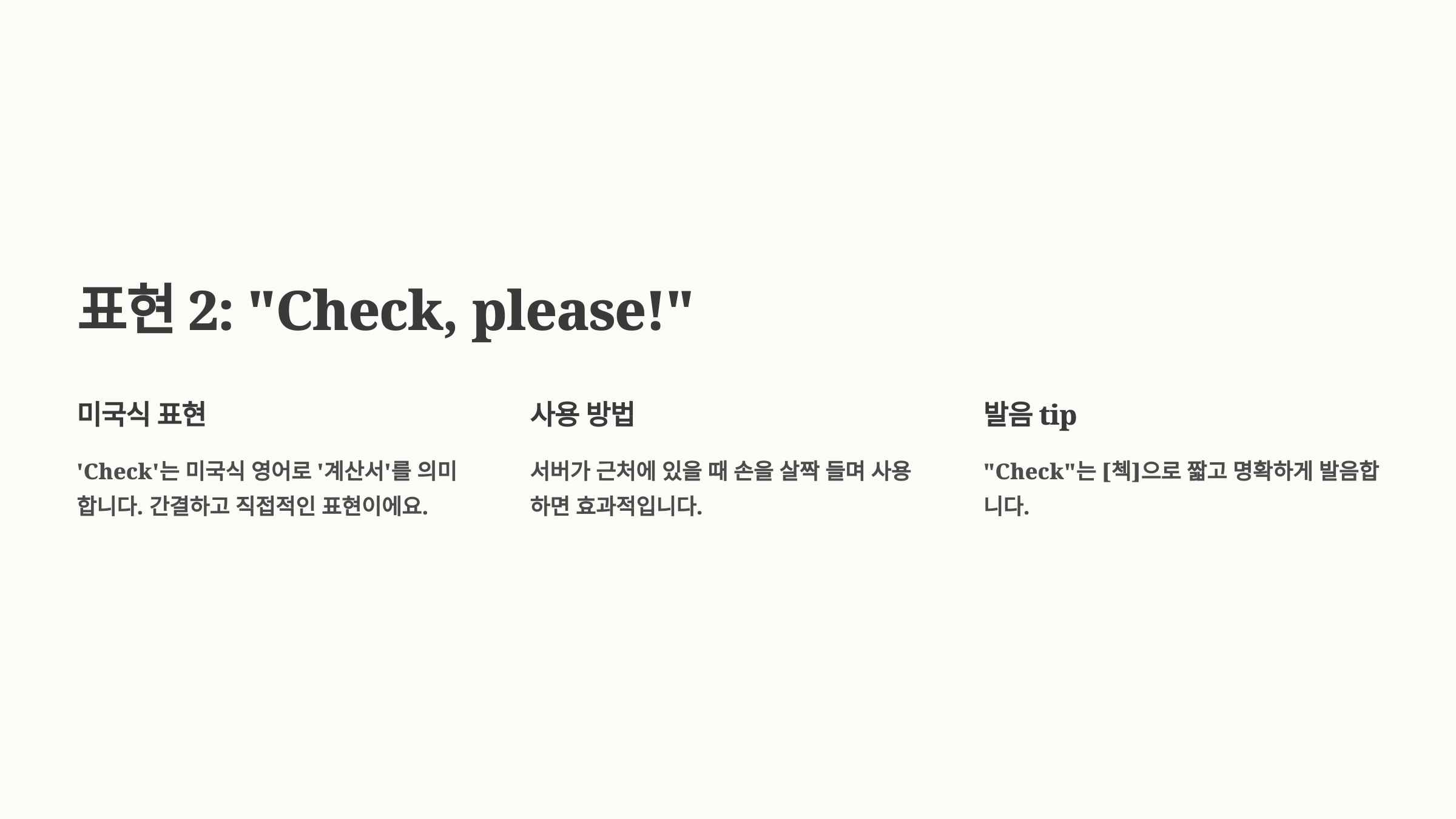 “Check, please!”는 가장 간단하고 빠르게 계산서를 요청하는 표현이에요. 미국식 표현으로, 레스토랑이나 바에서 아주 자주 들을 수 있는 말이에요.