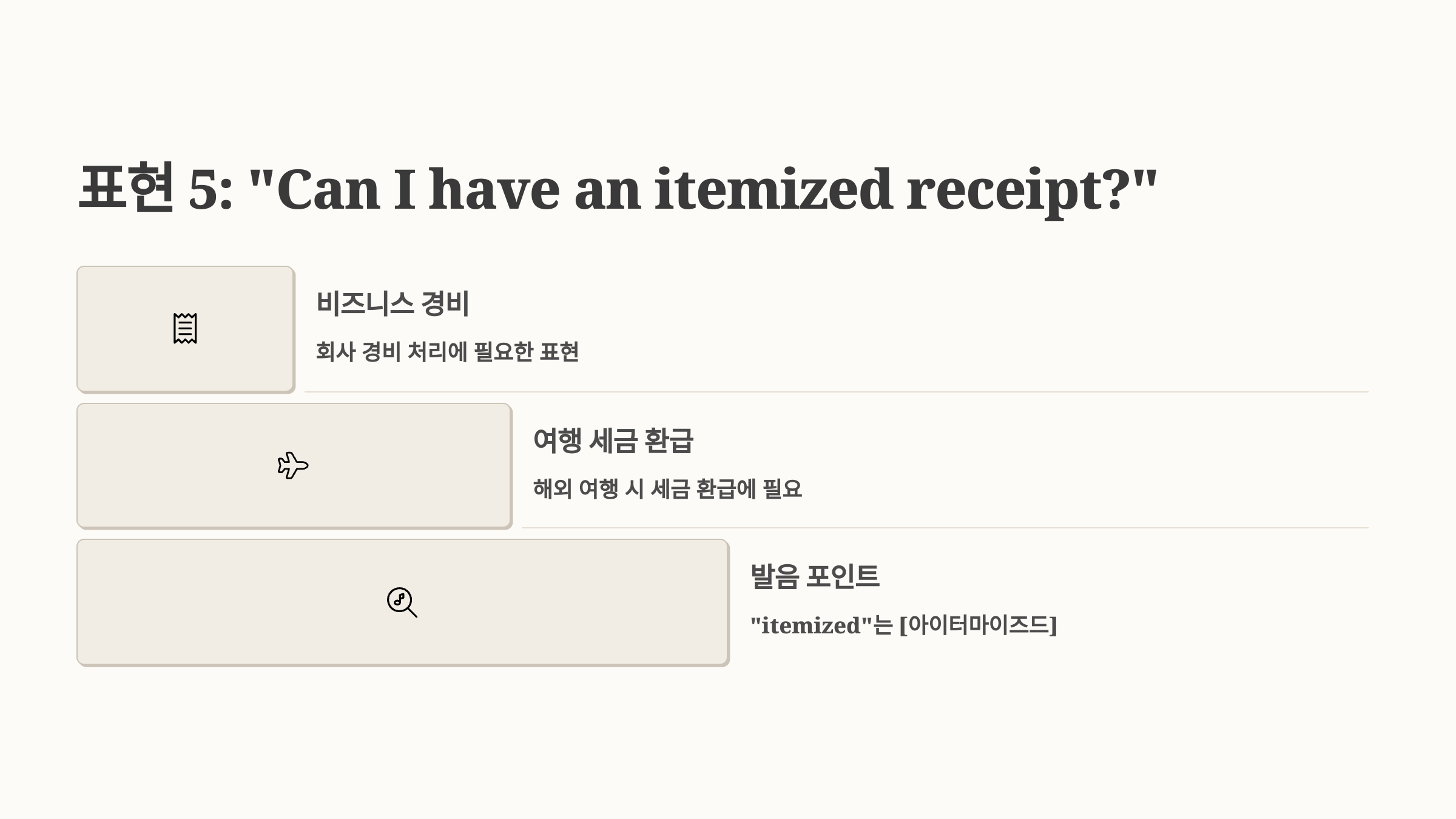 출장, 경비 처리, 영수증 제출이 필요한 상황이라면 Can I have an itemized receipt? 이 한 마디로 확실하게 요청할 수 있어요! 😎📃