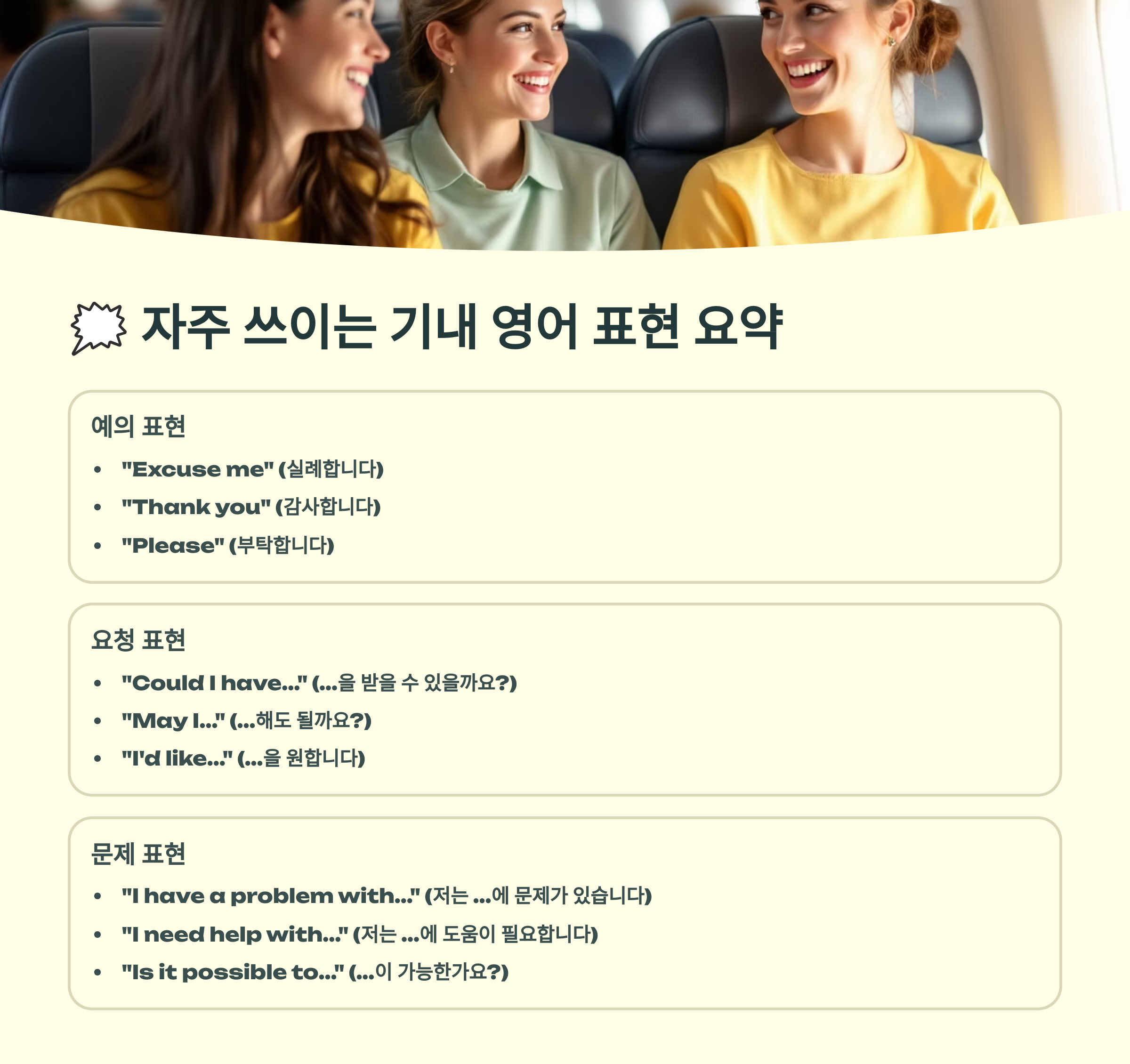 ✔ 이 문장들만 외워도 기내에서 필요한 상황의 90% 이상은 해결할 수 있어요! 자신감 있게 말하고, 웃으며 요청하는 것 잊지 마세요. 😊