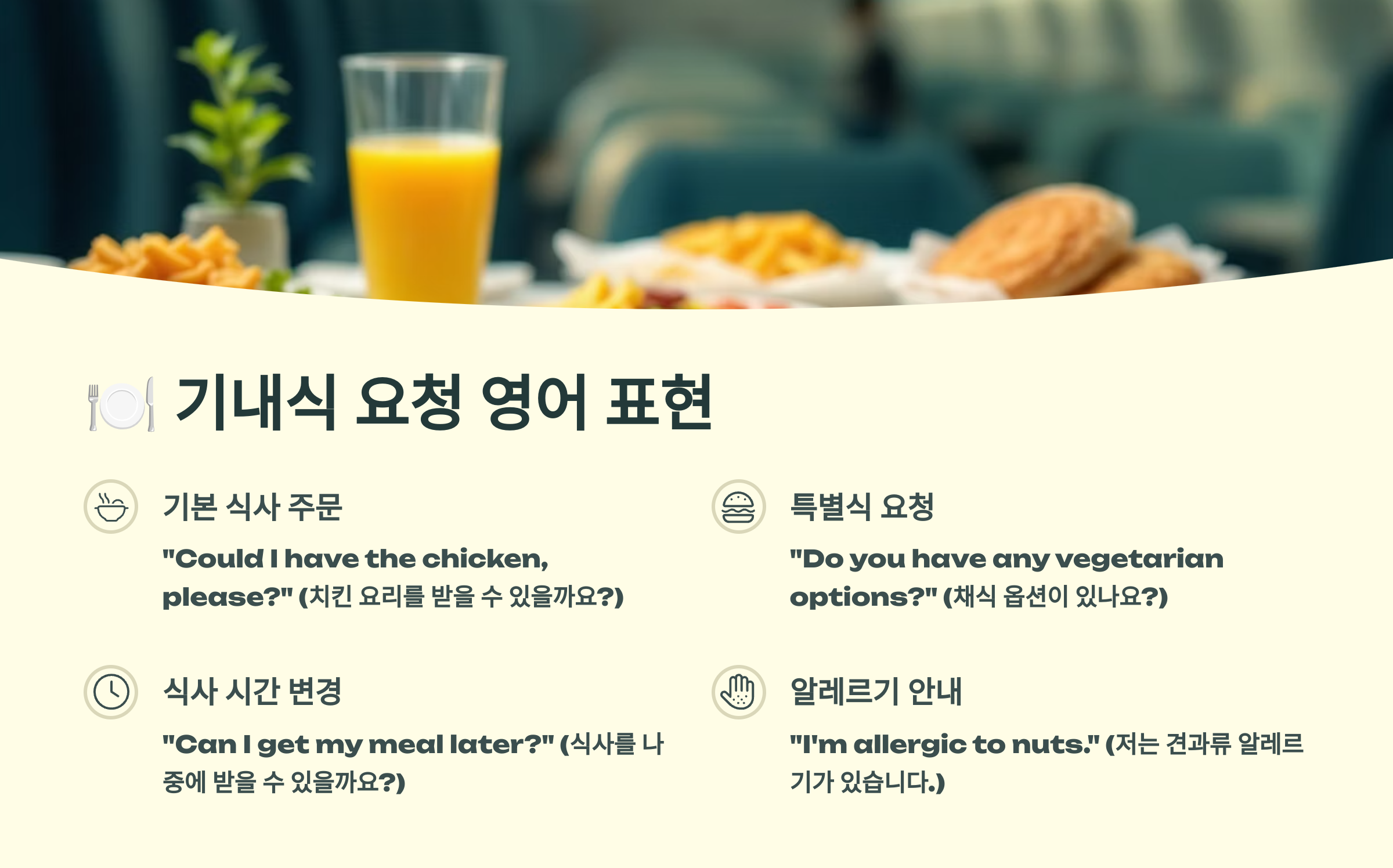 기내식은 장거리 비행 중 가장 기대되는 순간이기도 하죠! 채식 요청, 글루텐 프리, 메뉴 변경 등 상황별로 활용할 수 있는 실전 표현들을 소개할게요. 💬