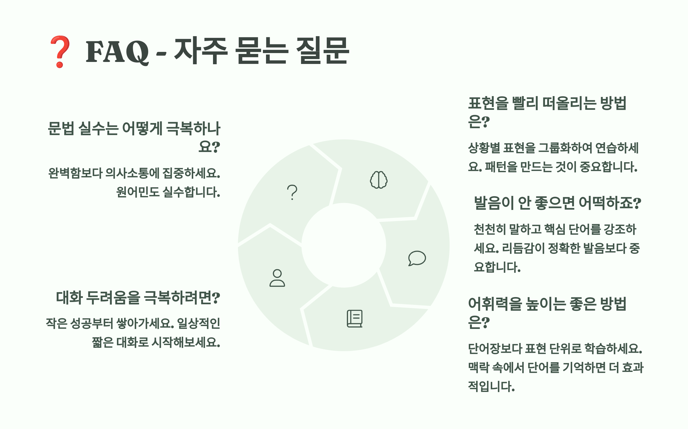 A3. 단어는 알아도 문장으로 말하는 연습이 부족해서예요. 단어 100개보단 표현 10개를 통째로 외우는 게 더 좋아요!