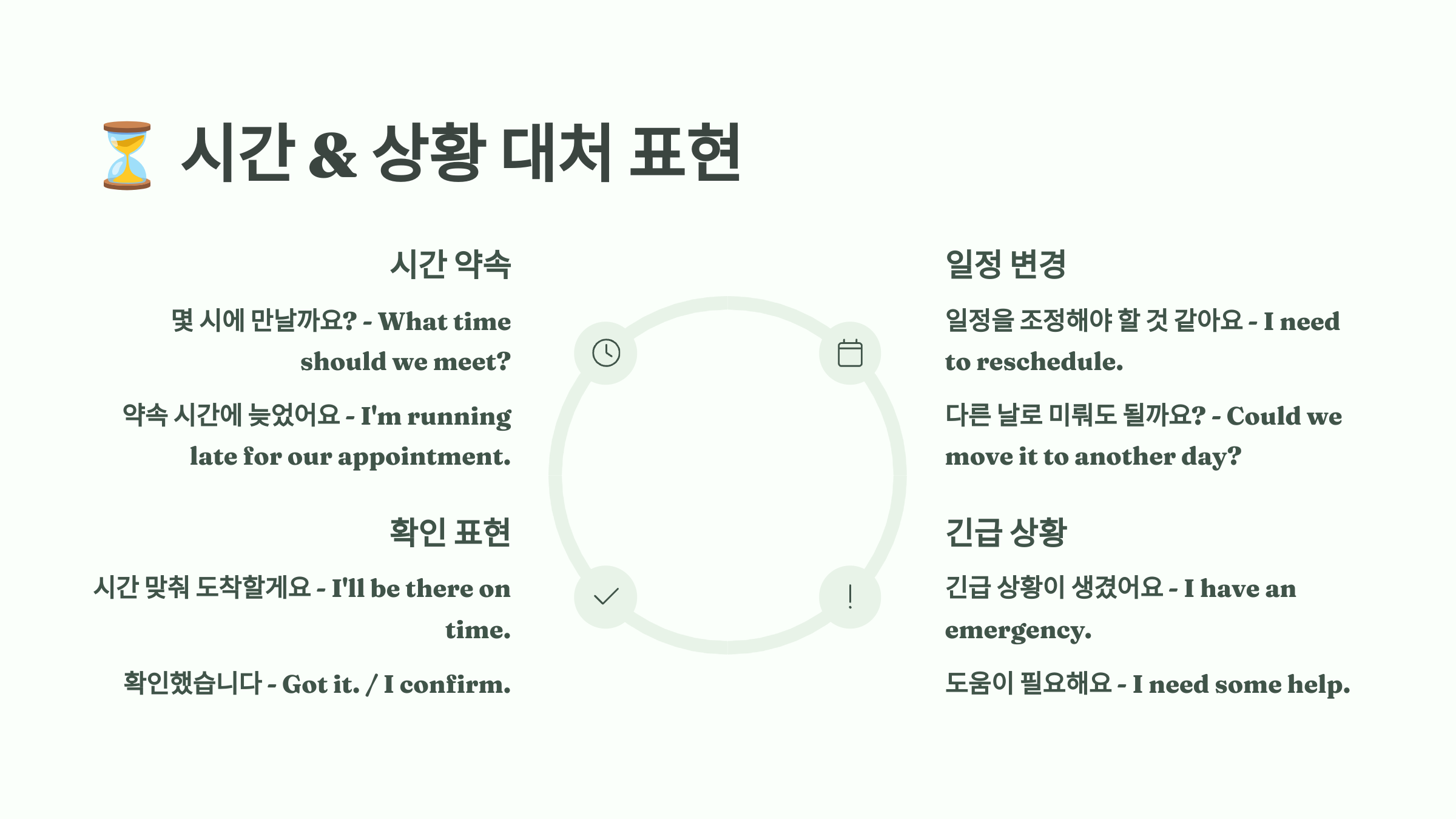 ⏳ 시간 & 상황 대처 표현 요약표
