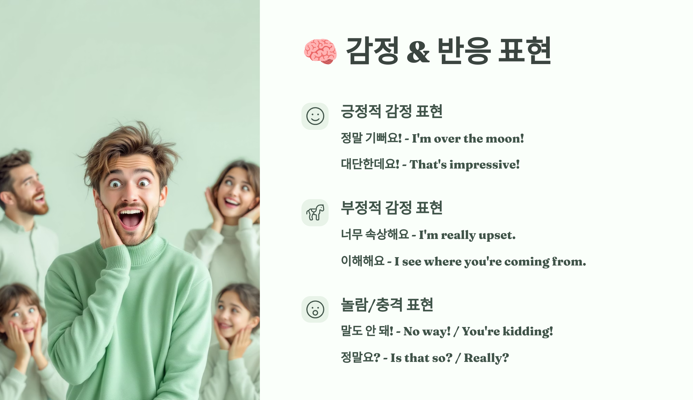다음은 대화 중 감정이나 반응을 표현하는 말들을 배워볼 거예요! 🧠