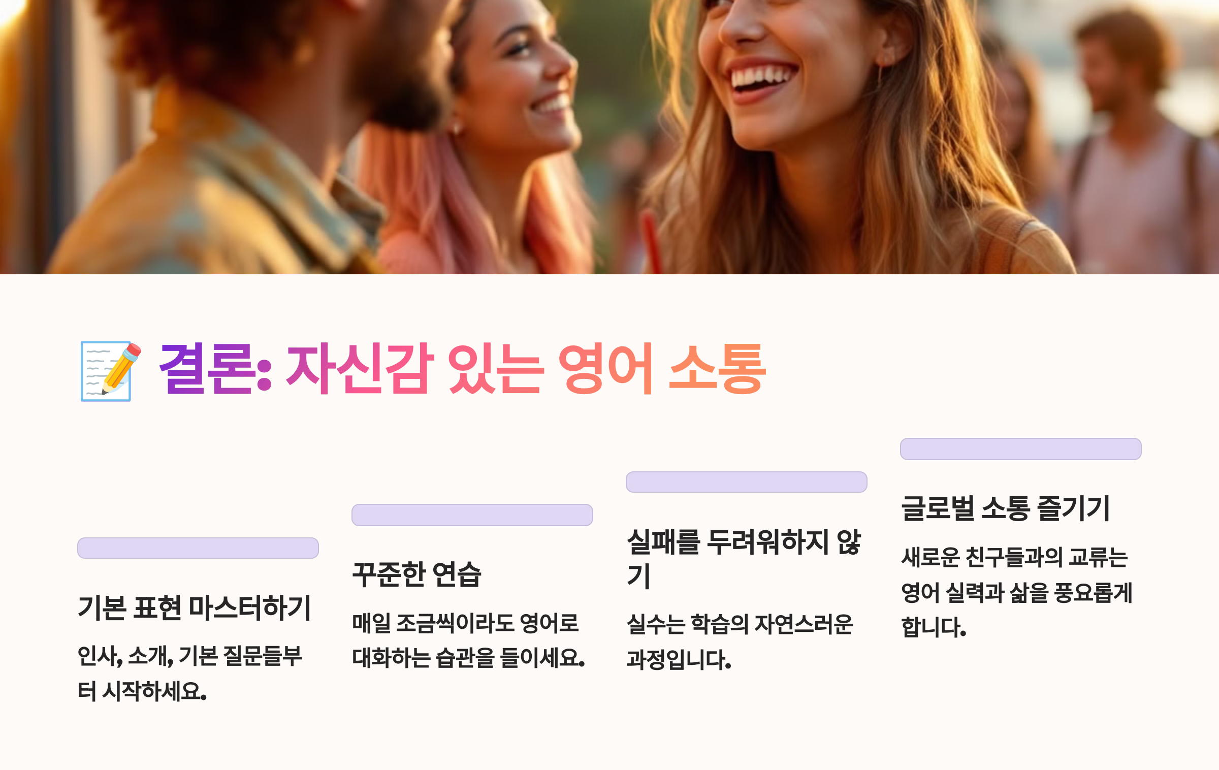 | 💬 일상 대화 영어 표현 총정리! 원어민처럼 말하는 기초 회화 문장 30선 (0) | 2025.04.11 |