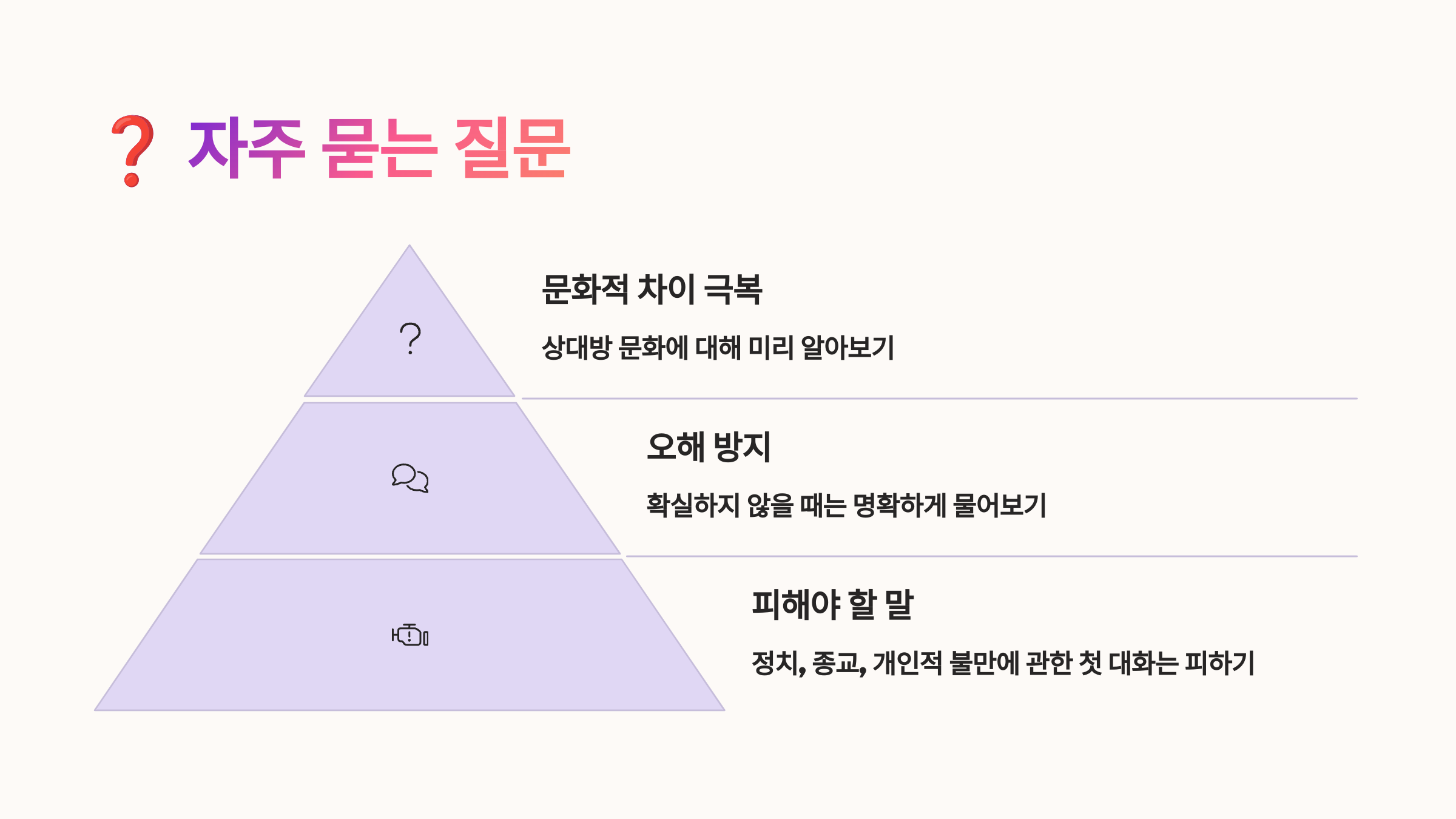- 🙋 낯선 사람에게는 “Is this your first time here?” 등 부드러운 질문 사용