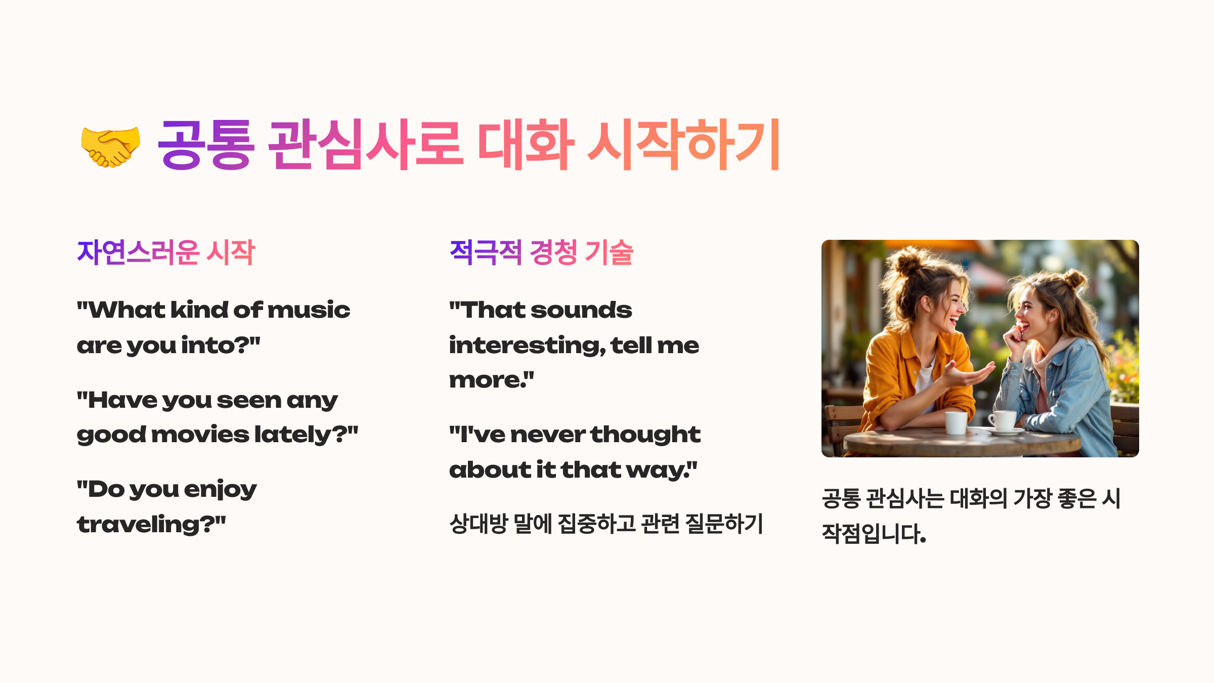 이제 첫 인사를 했으니, 대화를 이어갈 차례죠! 다음은 🤝 공통 관심사로 대화 시작하기 표현을 이어서 알려드릴게요!
