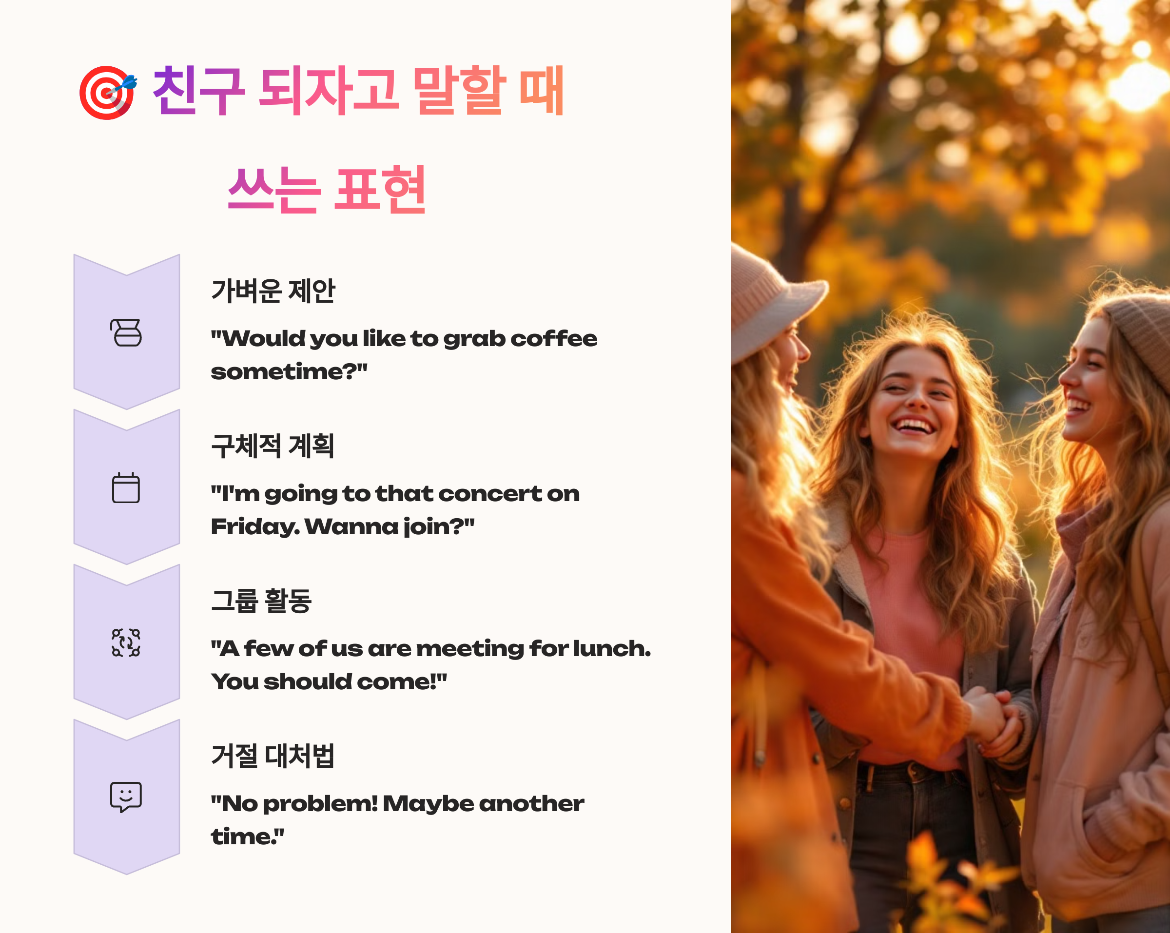이제 대화가 조금 이어졌다면, 친구가 되고 싶다는 마음을 표현해볼 수 있겠죠? 다음은 🎯 친구 되자고 말할 때 쓰는 표현을 알려드릴게요!