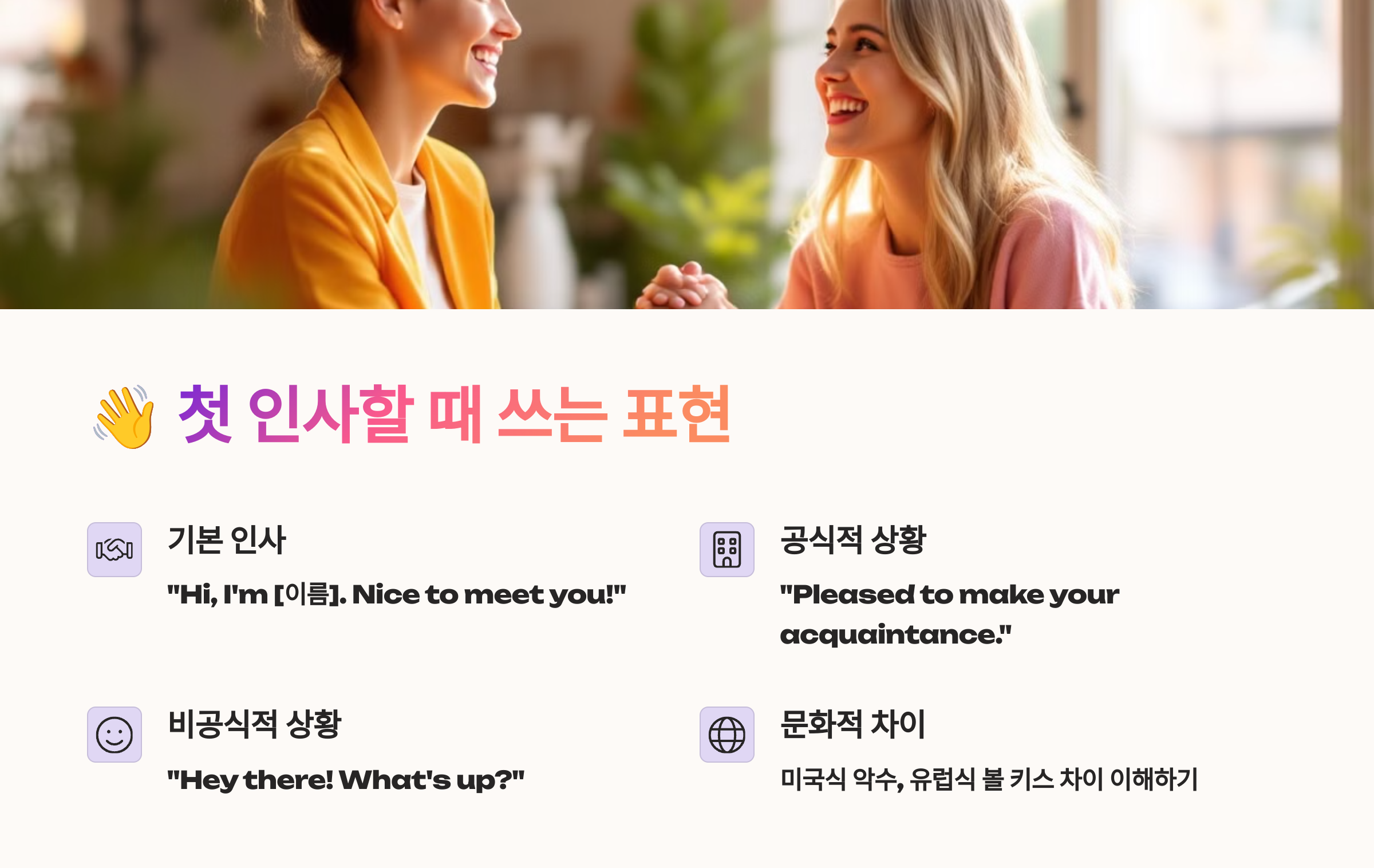 👋 친구가 되는 첫걸음은 역시 "인사"예요! 단순히 Hello를 넘어서 조금 더 다정하고 캐주얼한 느낌의 인사 표현을 알고 있으면 첫인상도 좋아지고, 자연스럽게 대화를 이어갈 수 있어요.
