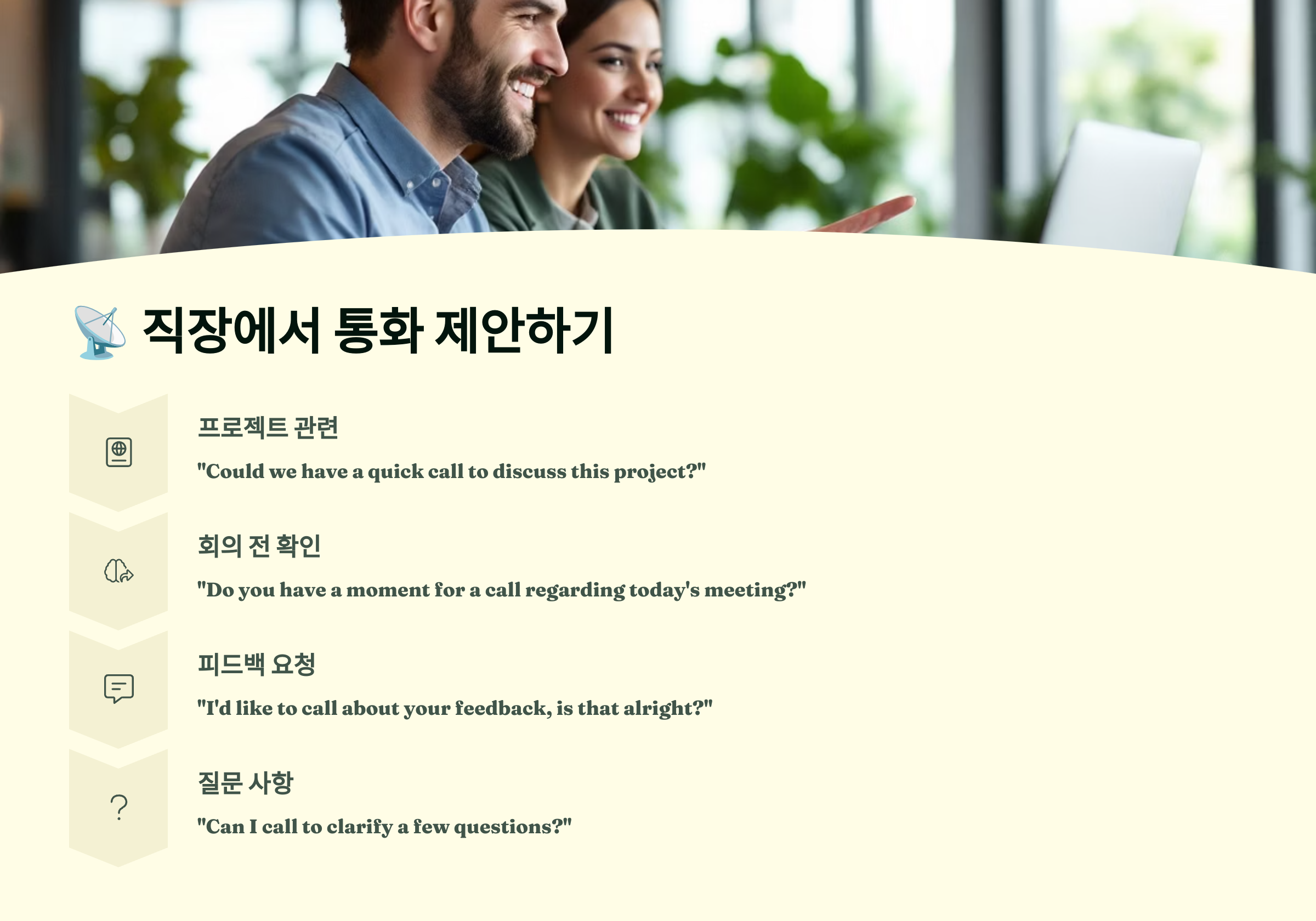 이제 직장에서 동료나 상사에게 자연스럽게 통화 요청하는 표현을 알아볼게요! 📡