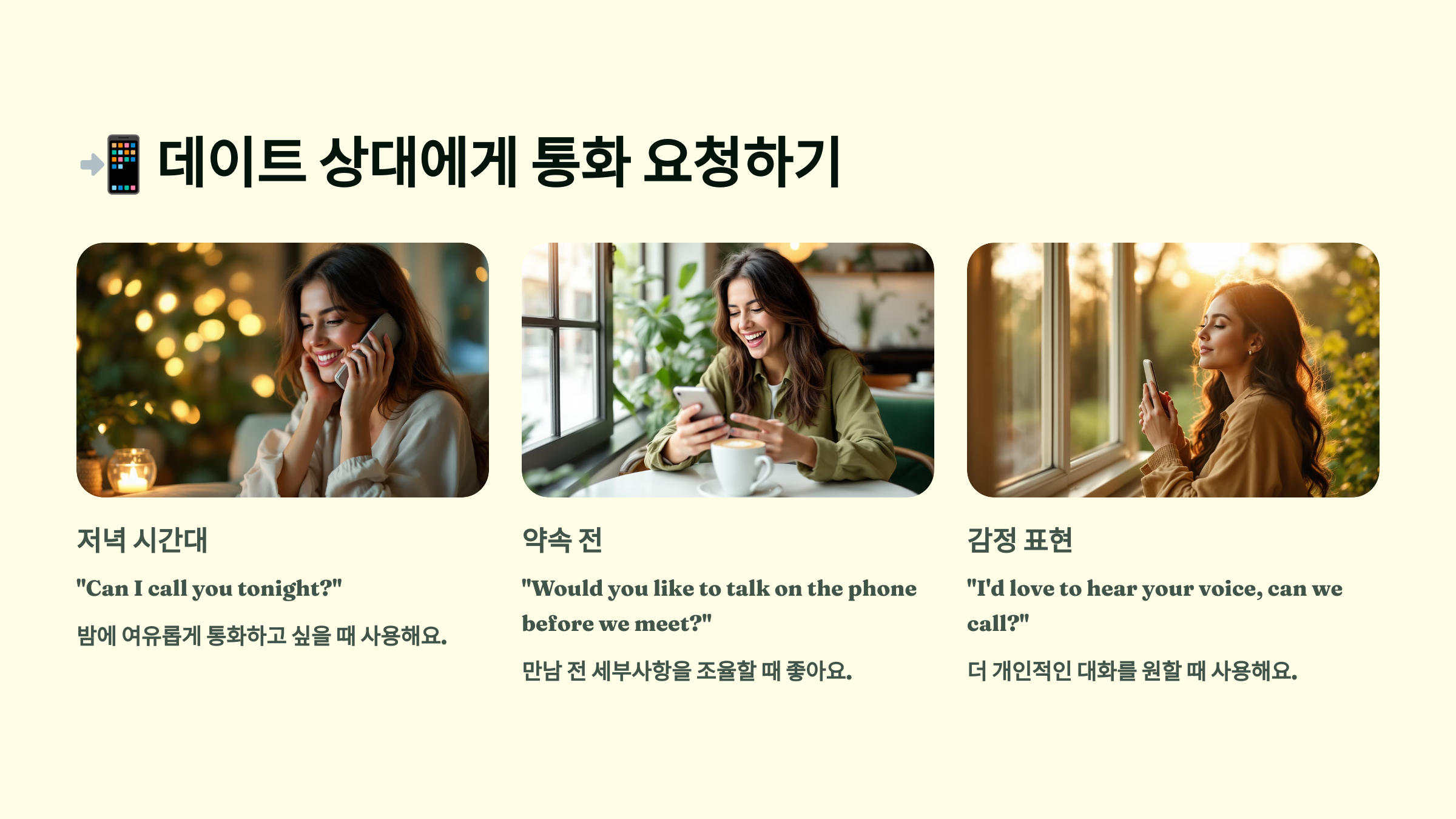 📲 데이트 중이거나 연인 사이에서는 통화 요청할 때 살짝 설레는 느낌이나 부드러운 뉘앙스를 살리는 게 중요해요. 딱딱하거나 급하게 들리면 분위기가 깨질 수 있거든요. 😊