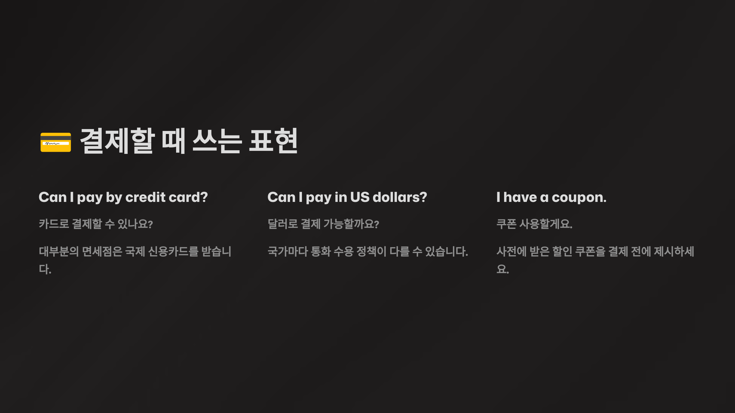 카드 결제 시 문제가 생겼다면 "My card isn’t going through." 또는 "Can you try again?"이라고 말하면 돼요. 가끔 외국에서는 한국 카드가 첫 시도에 인식이 안 되기도 하니까, 여유 있게 다시 시도하거나 다른 카드도 준비해두는 게 좋아요. 🧾