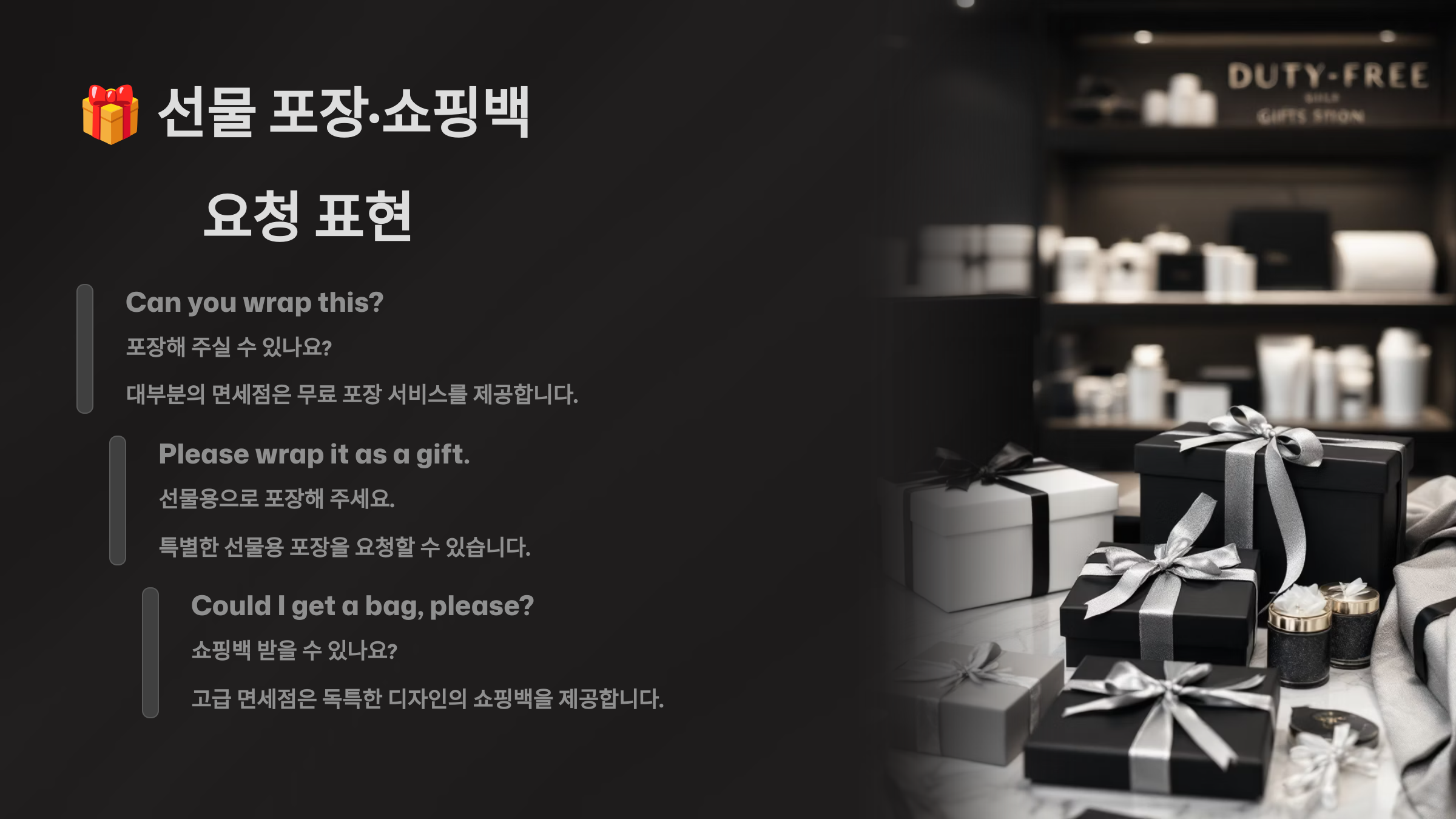 면세점에서 가족, 친구, 연인에게 줄 선물을 사는 경우가 많아요. 이럴 땐 예쁜 포장과 쇼핑백까지 함께 챙겨야 완벽한 선물이 되죠! 해외 매장에서 직원에게 자연스럽게 포장을 요청하거나, 추가 쇼핑백을 받을 수 있는 실용 표현들을 지금부터 알려드릴게요. 💝