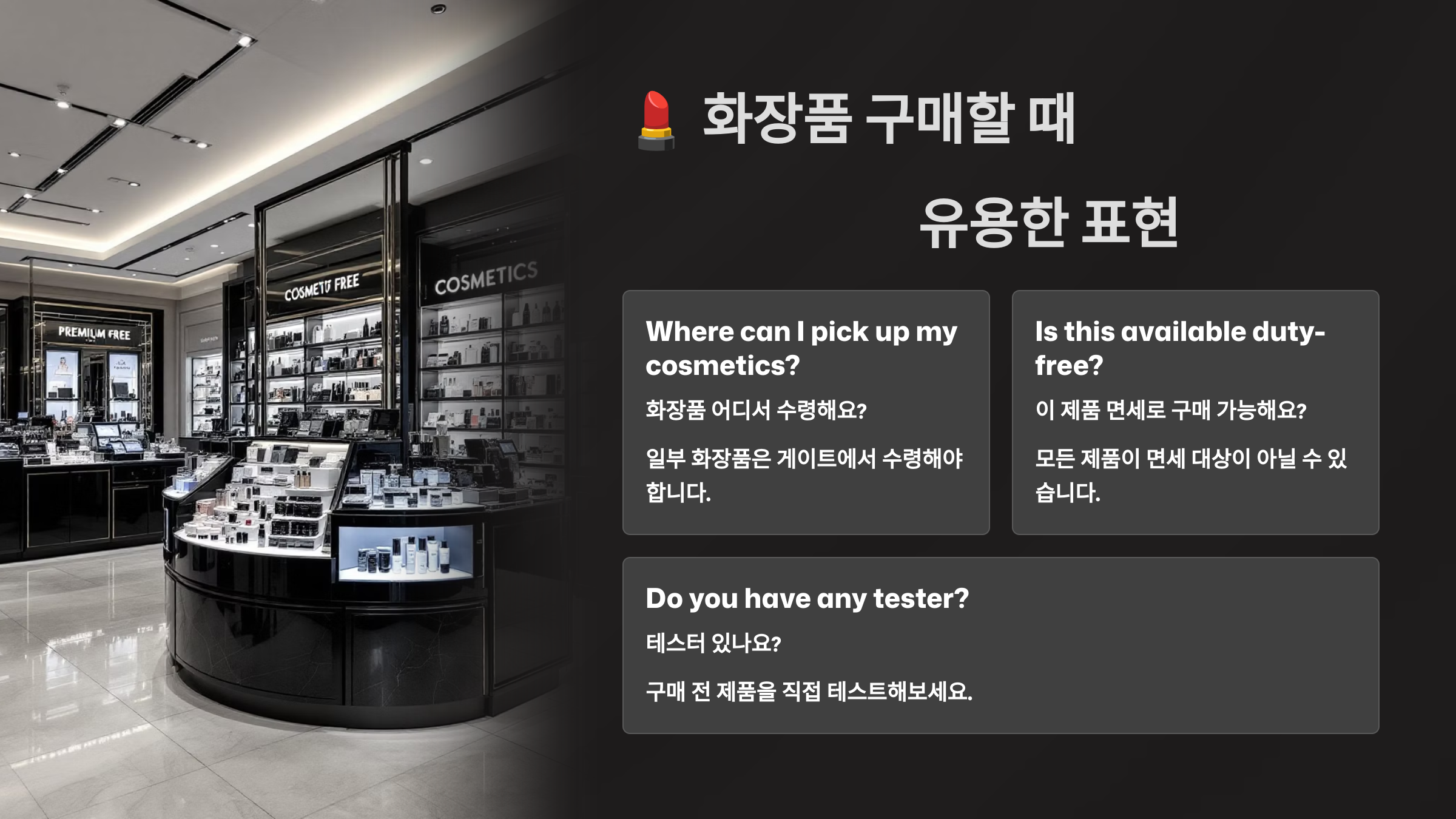 특히 면세점은 다양한 국적의 관광객이 모이기 때문에 영어가 기본 언어로 사용되는 곳이에요. 그렇기 때문에 간단한 표현만 익혀도 훨씬 수월하게 원하는 제품을 찾고, 가격을 묻고, 편하게 쇼핑할 수 있답니다. ✨