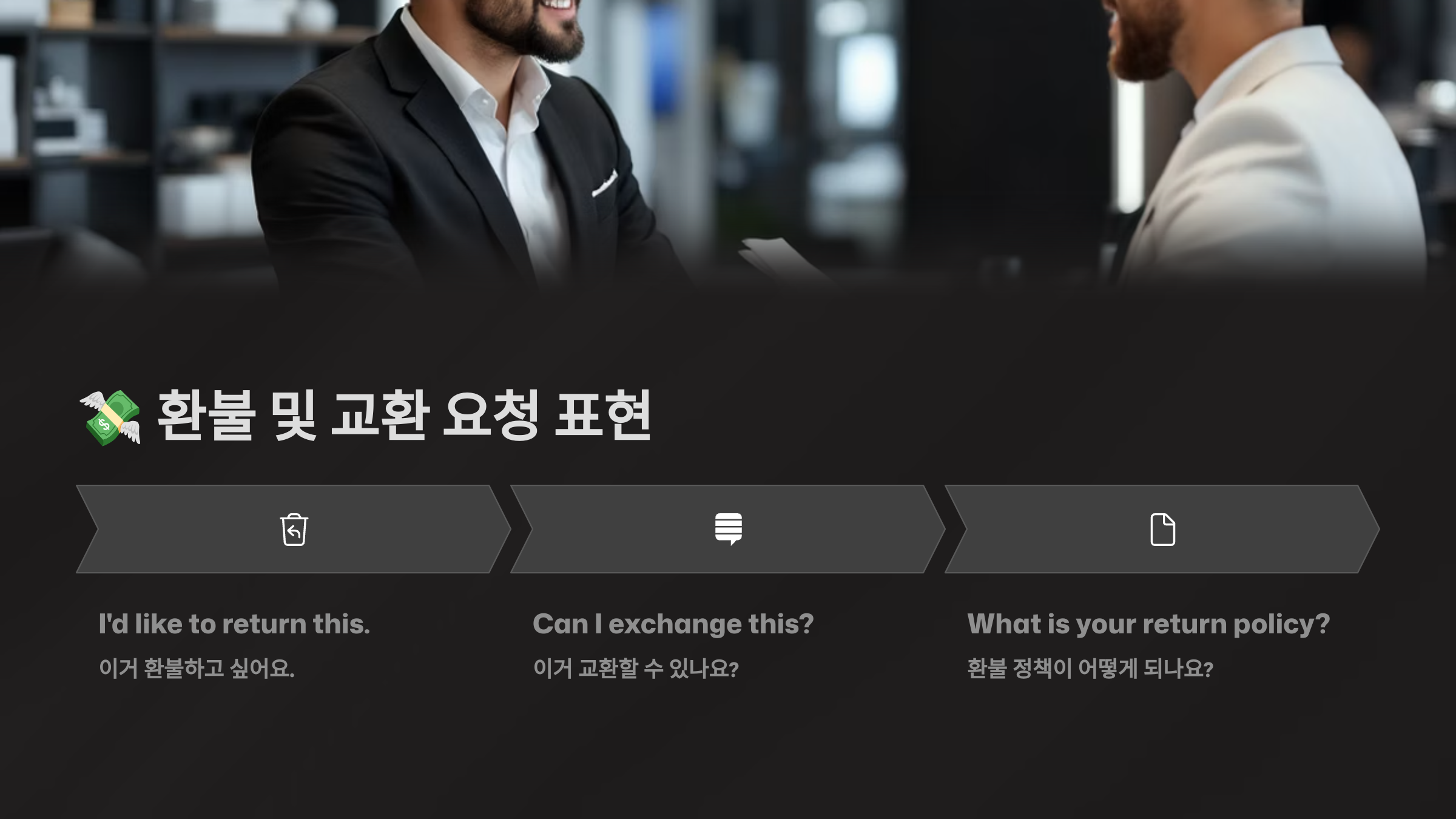 환불 또는 교환을 요청할 때 영수증을 제시하면서 "Here’s the receipt." 또는 "I have the proof of purchase."라고 말하면 좋고, 패키징이 열리지 않은 상태라면 "It’s unopened."라고 덧붙이면 훨씬 신뢰를 얻을 수 있어요. 🧾📄