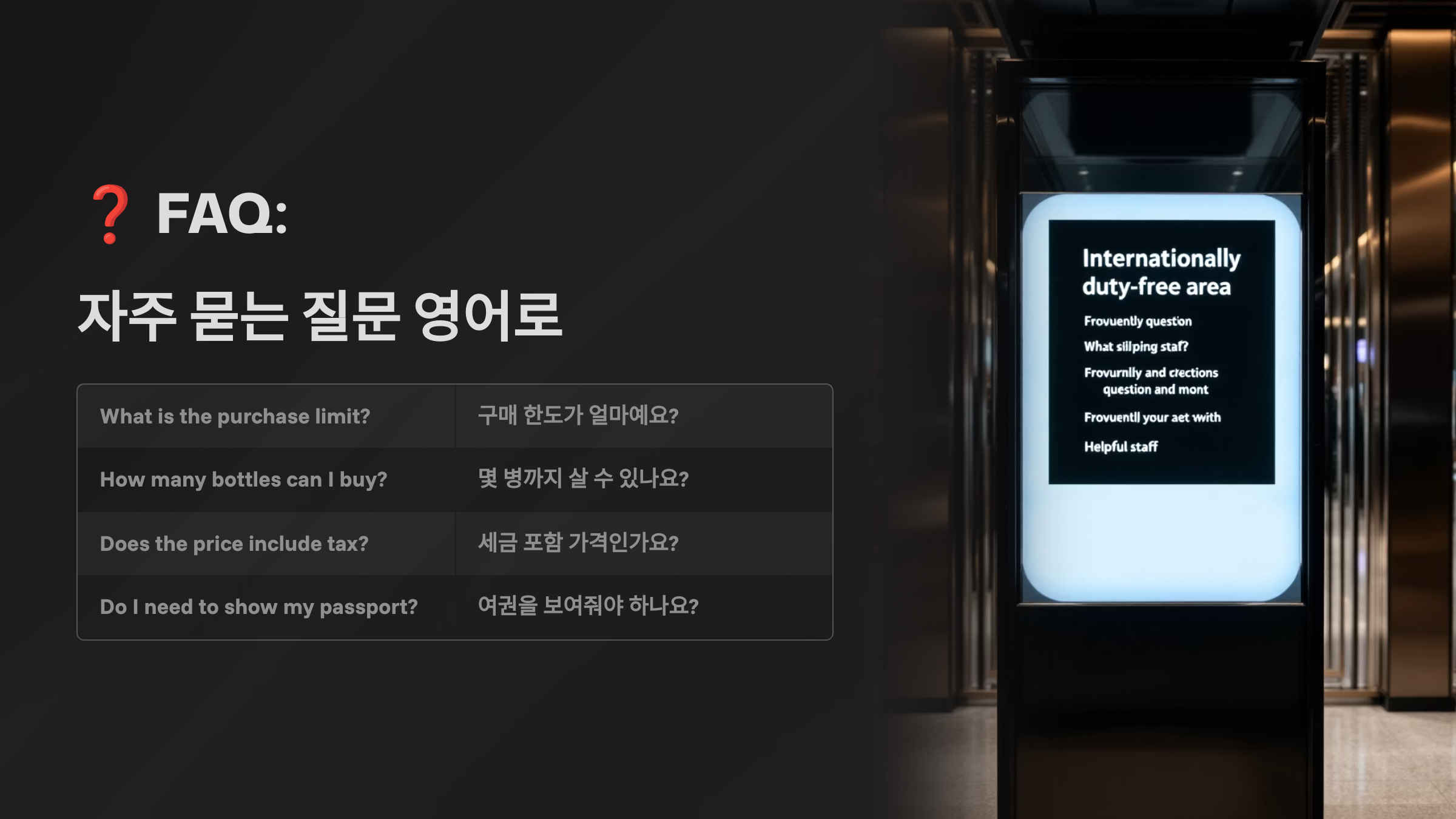 면세점 쇼핑을 하다 보면 궁금한 게 생길 수밖에 없어요. 물건의 위치, 재고 유무, 프로모션, 구성품 등 어떤 상황이든 직원에게 자연스럽고 정중하게 질문하는 게 중요하답니다. 영어가 서툴러도 자신 있게 다가가면 대부분 친절히 도와줘요. 😄