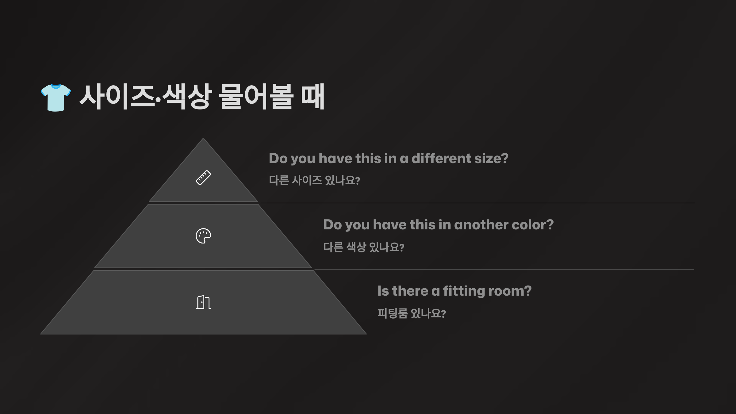 사이즈와 컬러 문의는 간단한 문장으로도 충분히 소통 가능해요! 몇 번만 연습해두면 실전에서도 당당하게 말할 수 있을 거예요! 💪👚