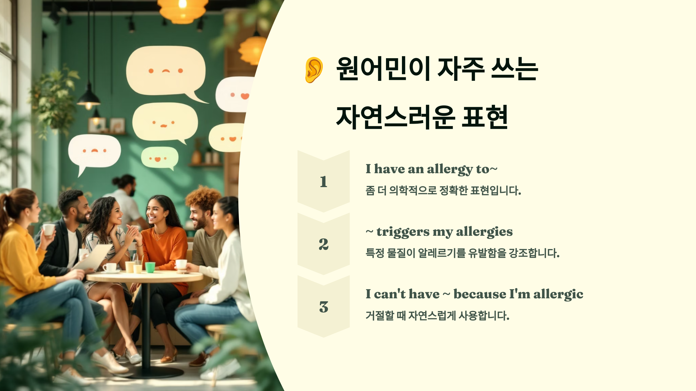 🤧 알레르기가 있을 땐 말 한 마디가 정말 중요해요. 특히 해외에서는 단순히 “I’m allergic to~”만 알고 있으면 아쉬울 수 있어요. 오늘 배운 표현처럼 원어민들이 실제로 쓰는 다양한 방식을 알면, 훨씬 더 안전하고 자연스럽게 의사소통할 수 있답니다.