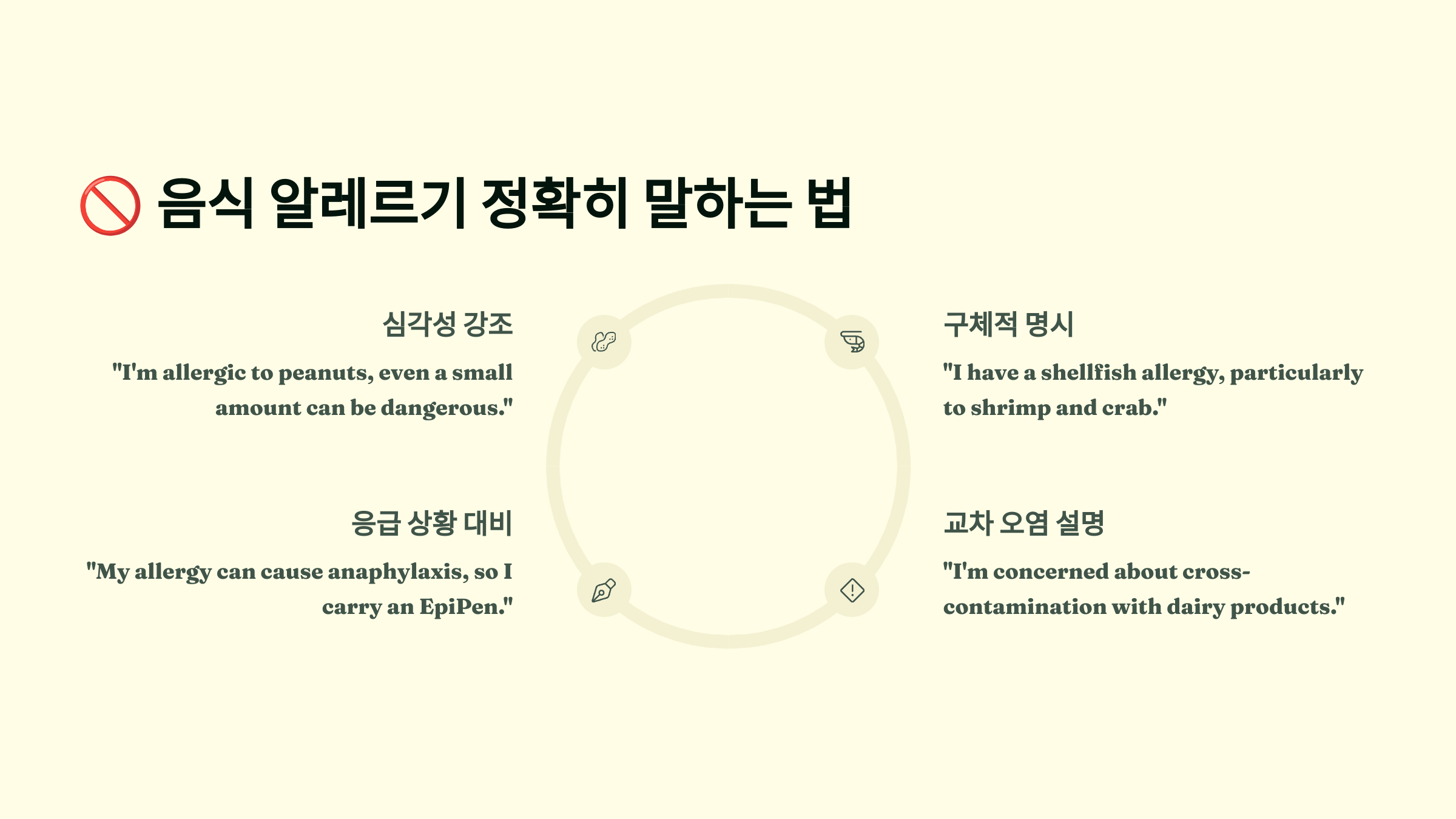 💡 “알레르기 있어요”라는 말 하나도 상황에 따라 이렇게 다양하게 표현할 수 있어요! 다음 섹션에서는 실제 알레르기 상황별 대화 예시를 통해 더 생생하게 배워볼게요. 😊
