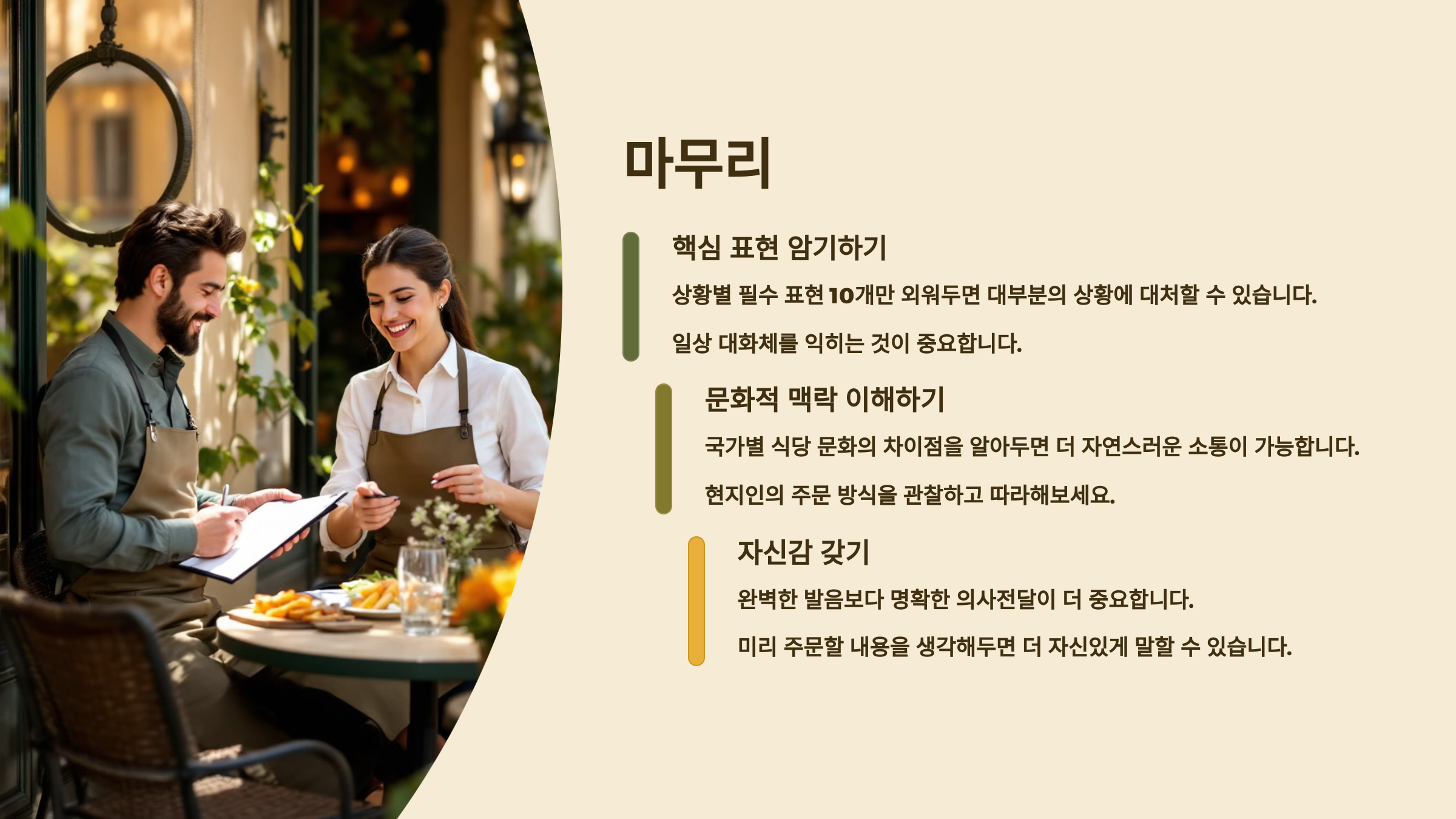 특히 팁, 알레르기, 포장 요청 같은 부분은 꼭 알아야 하는 표현들이니 자주 복습해두면 여행 갈 때 진짜 유용하게 써먹을 수 있어요. 이제는 더 이상 레스토랑에서 ‘말문이 막히는’ 일은 없을 거예요! 🙌