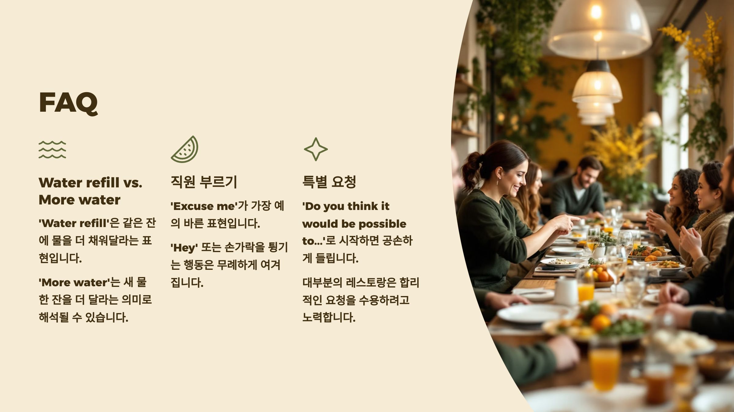 내가 생각했을 때, 영어 주문은 말 잘하는 기술보다 상대방을 배려하는 마음과 예의가 더 중요해요. 표현이 조금 서툴러도 부드럽게, 천천히, 웃으면서 말하면 어떤 나라에서든 좋은 서비스 받을 수 있어요. 😊