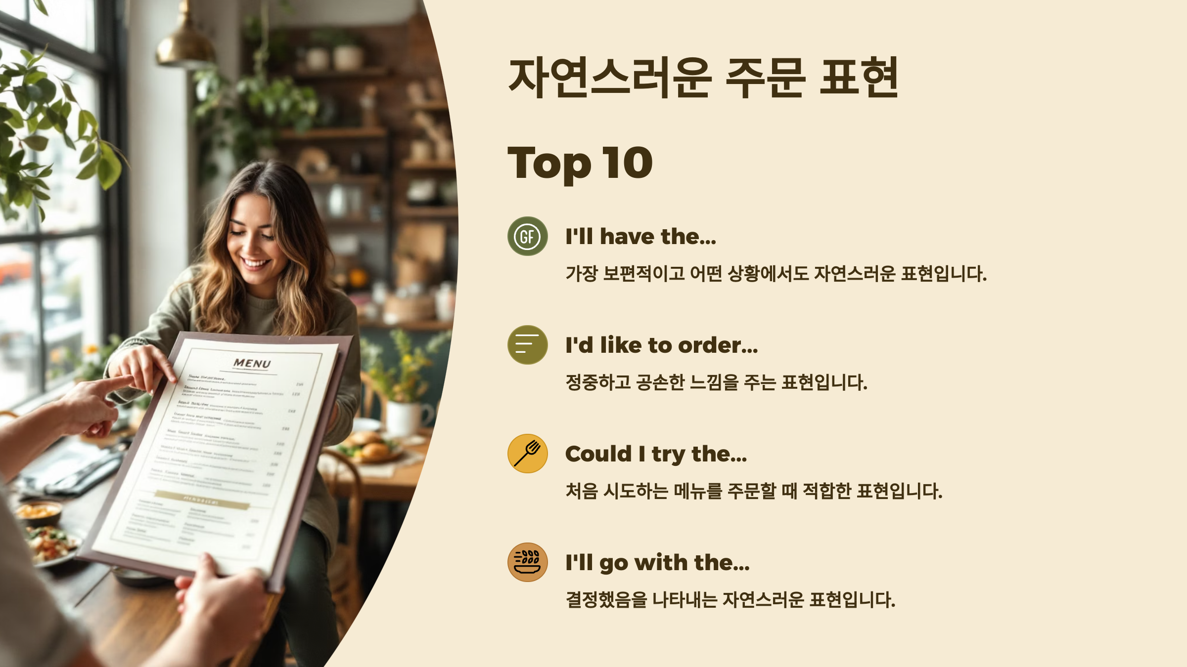 식당에서 “Can I get~?” 말고도 정중하고 자연스러운 표현이 정말 많아요! 아래 10가지 표현은 상황에 따라 바꿔 쓸 수 있고, 실제로 원어민이 자주 사용하는 주문 영어예요. 🗨️