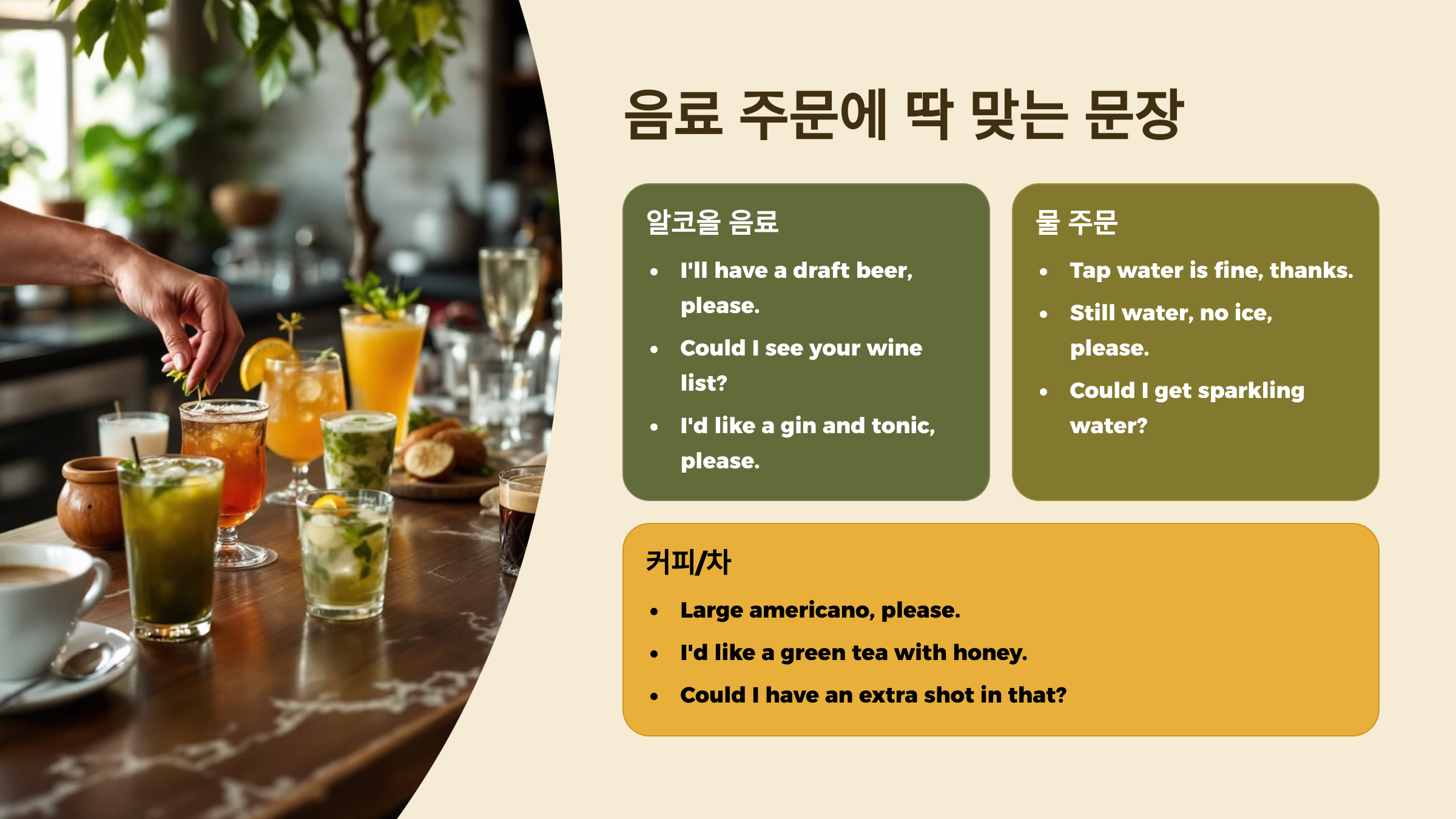 음료 주문도 단순히 “A Coke, please”로 끝낼 수 있지만, 조금만 더 부드럽게 말하면 훨씬 자연스러워져요! 특히 음료는 옵션(ice, size, refill 등)이 많아서 문장에 정보를 담는 연습이 필요해요. 🧃