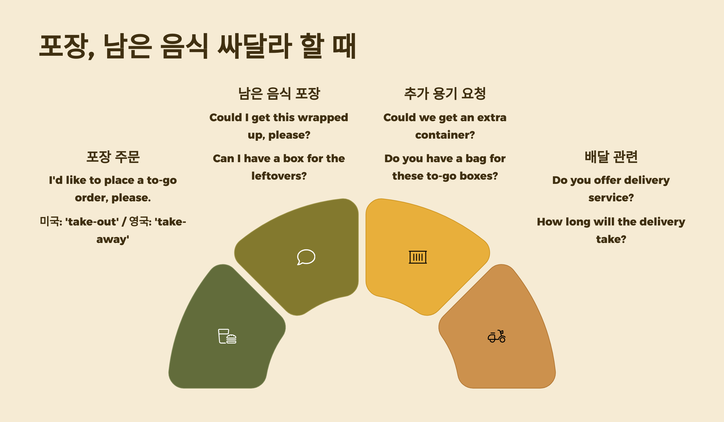 • 📦 Can we order this for takeout? (이거 포장 주문 가능한가요?)
